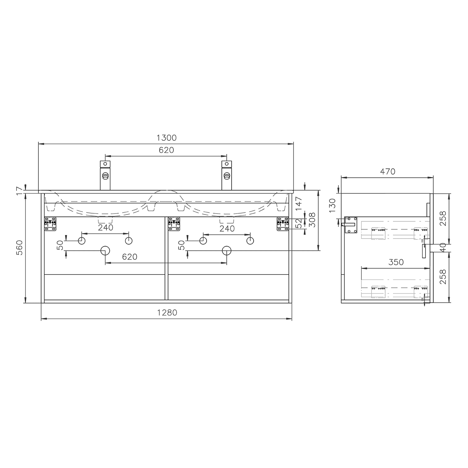 Lodge Doppel-Waschtischunterschrank 128 cm mit 4 Auszügen für Waschtisch Geberit Renova