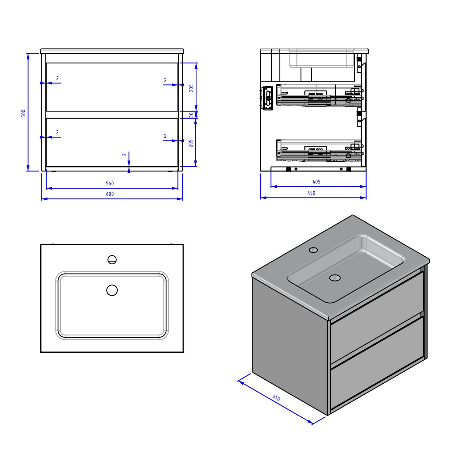 Loft Waschtisch mit Unterschrank 60 cm, 2 Auszüge