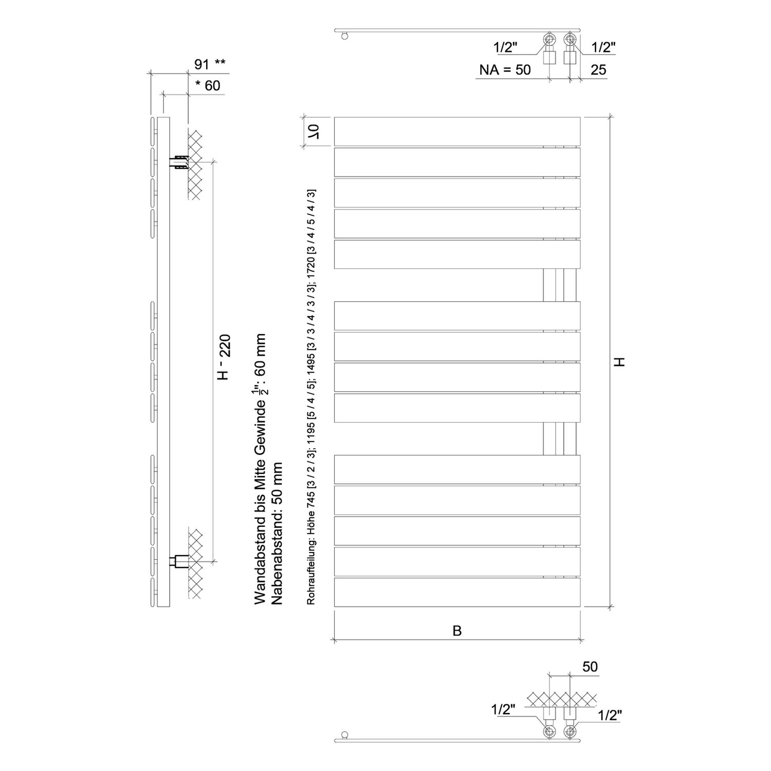 Plan Open E Badheizkörper 50 x 149,5 cm, rein elektrisch, Heizstab Typ 3, Öffnung links