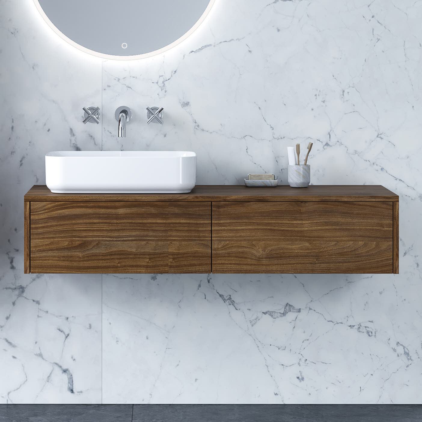 Bestes Design muss nicht teuer sein. Art Badmöbel zeichnen sich durch ihre grifflose Front aus - minimalistisch-modern und pflegeleicht. Drei attraktive Farbvarianten stehen zur Wahl: matt-schwarz, matt-weiß und amalfi holz dekor.