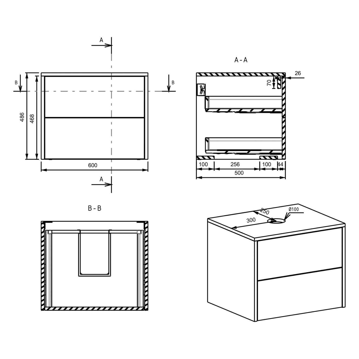 Art Waschtischkonsole 60 cm mit 2 Auszügen