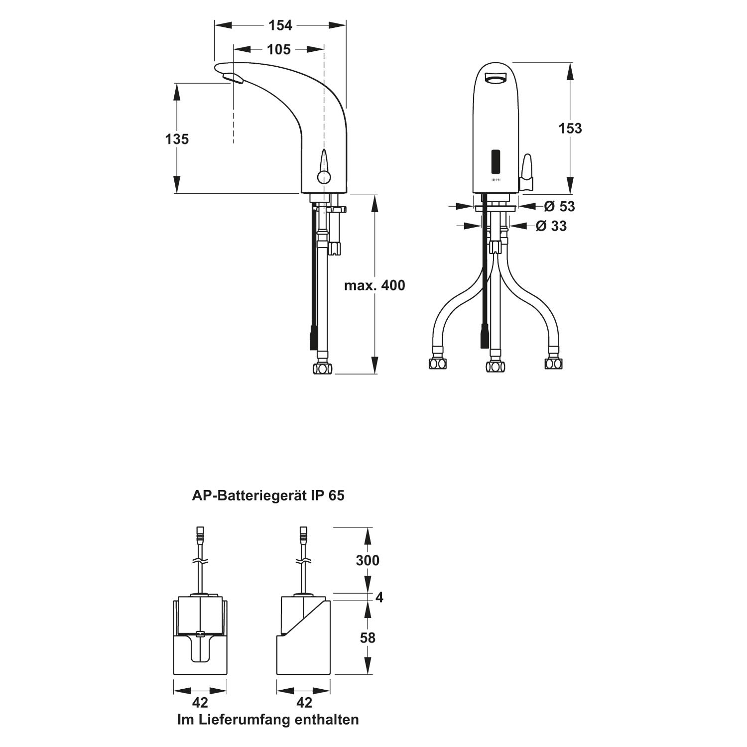 - 1 Batteriegerät 6 VDC, Schutzart IP 65 (zur Montage unter dem Waschtisch)