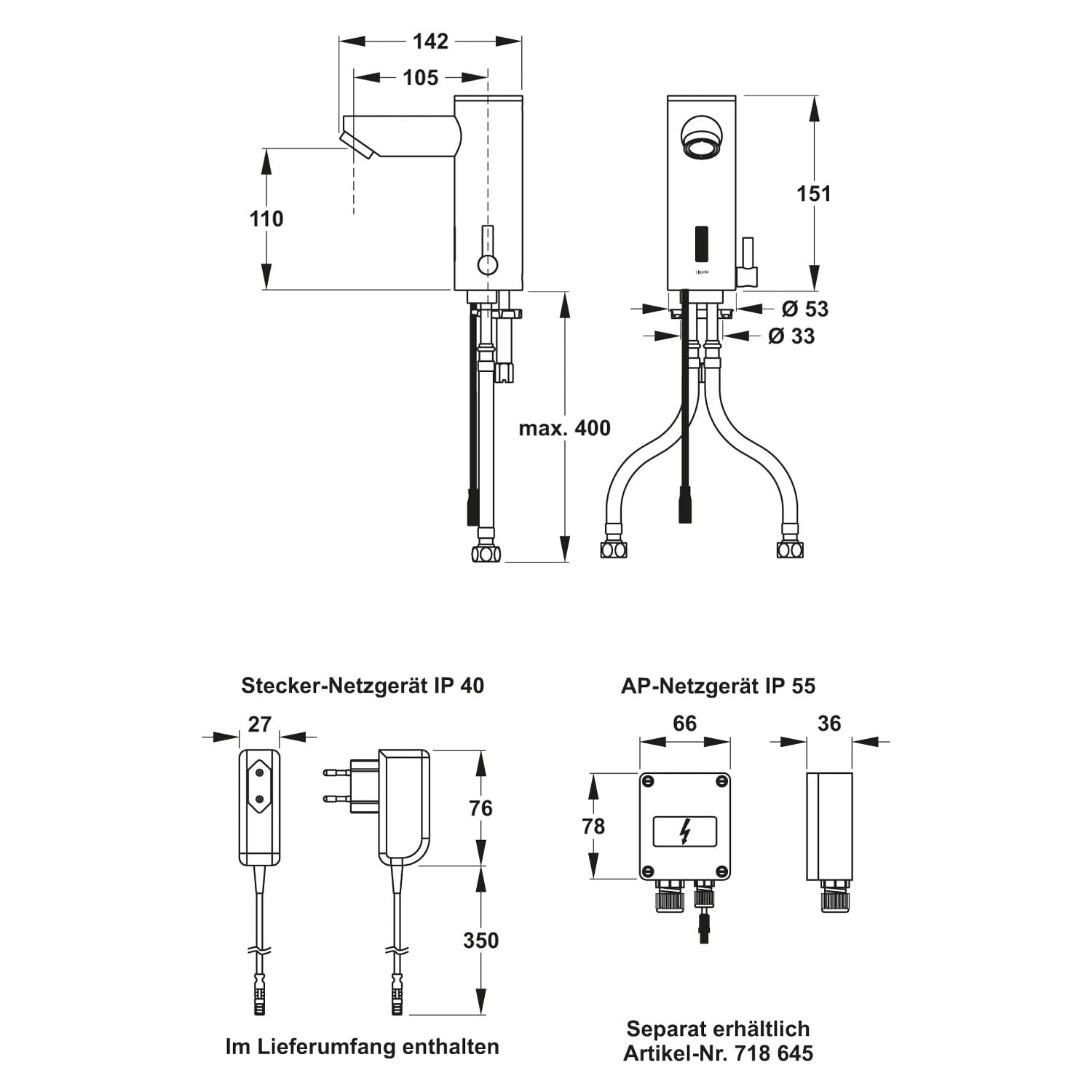 - 1 Armatur mit integrierter Infrarot-Näherungselektronik und Magnetventil