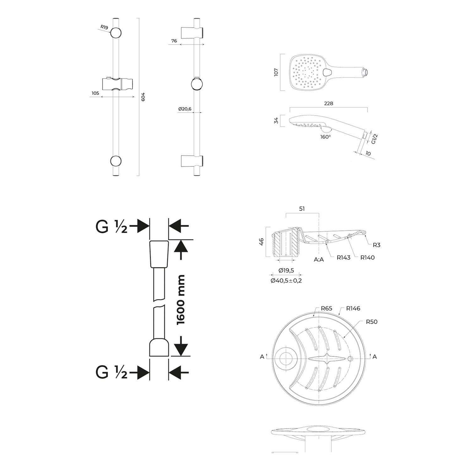 Handbrause rechteckig, mit Brausestange u. Seifenschale