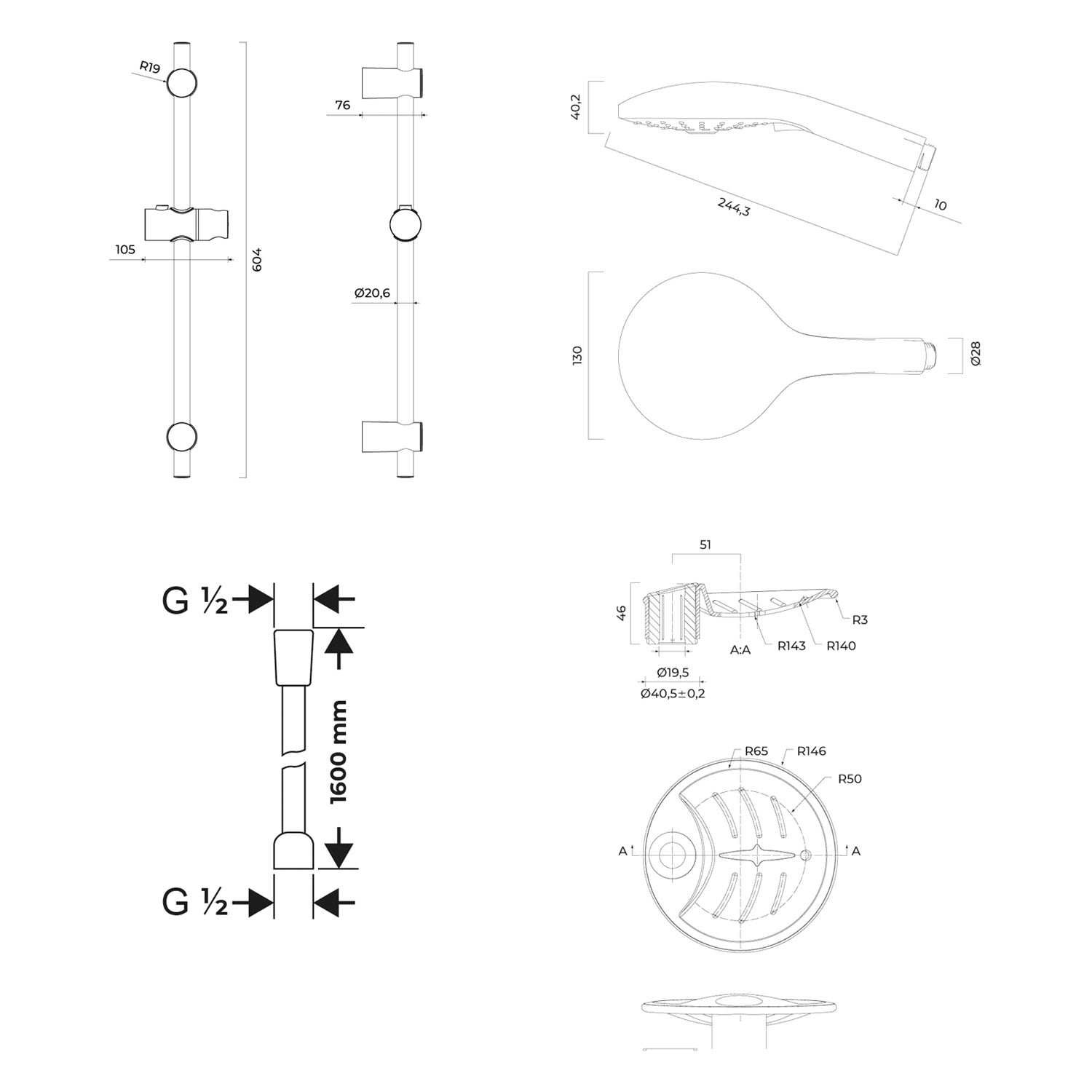 Handbrause rund Ø 13 cm, mit Brausestange u. Seifenschale