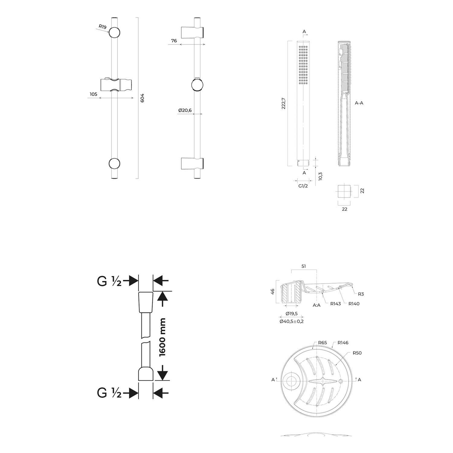 Stabhandbrause quadr., mit Brausestange u. Seifenschale