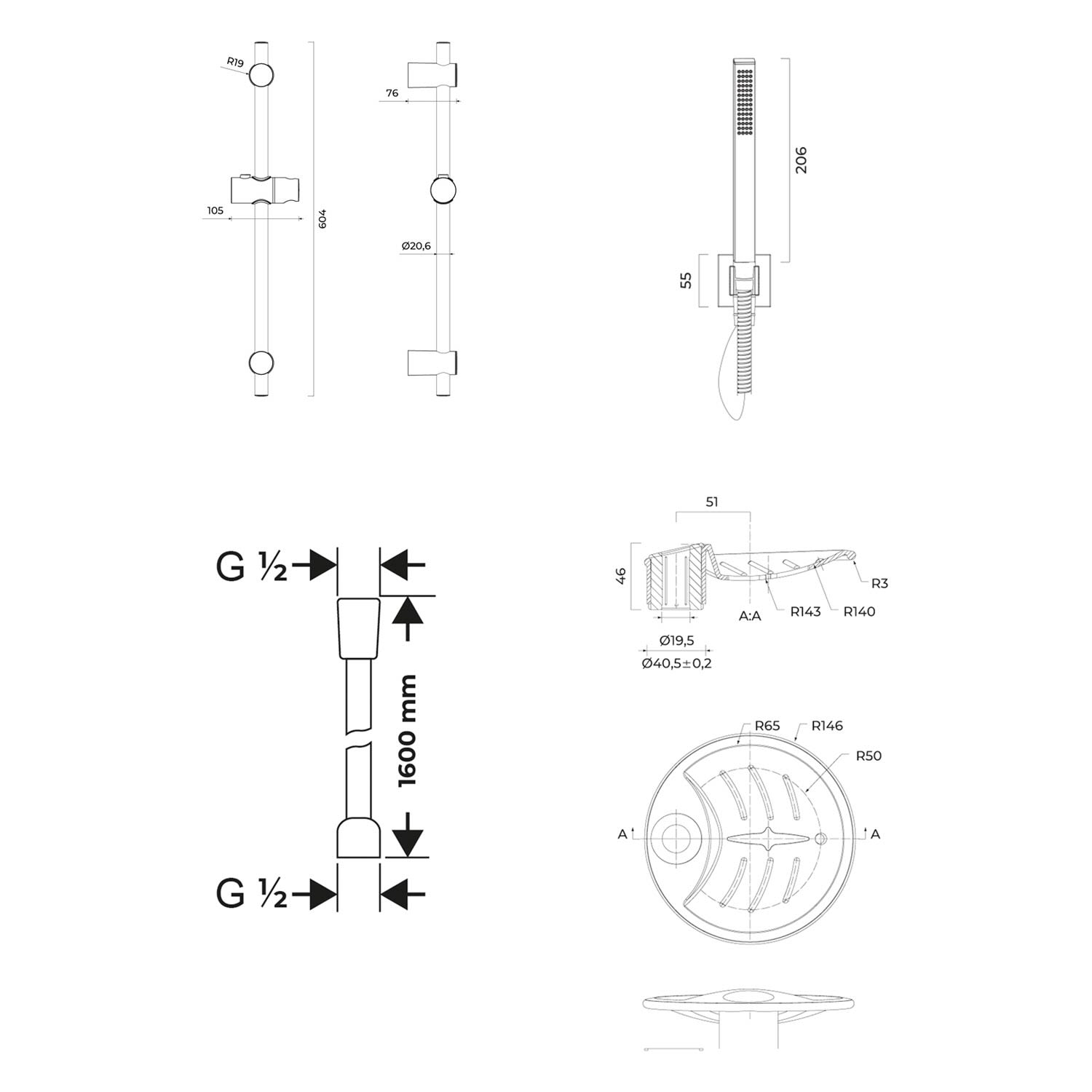 Stabhandbrause quadr., mit Brausestange u. Seifenschale