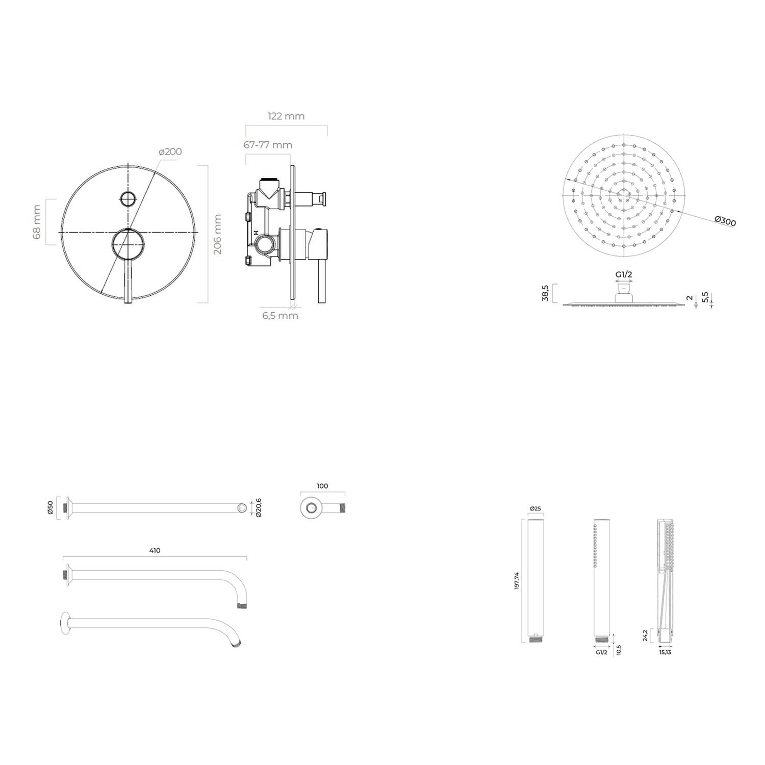 - Anschluss für Regendusche oder ¾-Zoll-Wannenauslauf