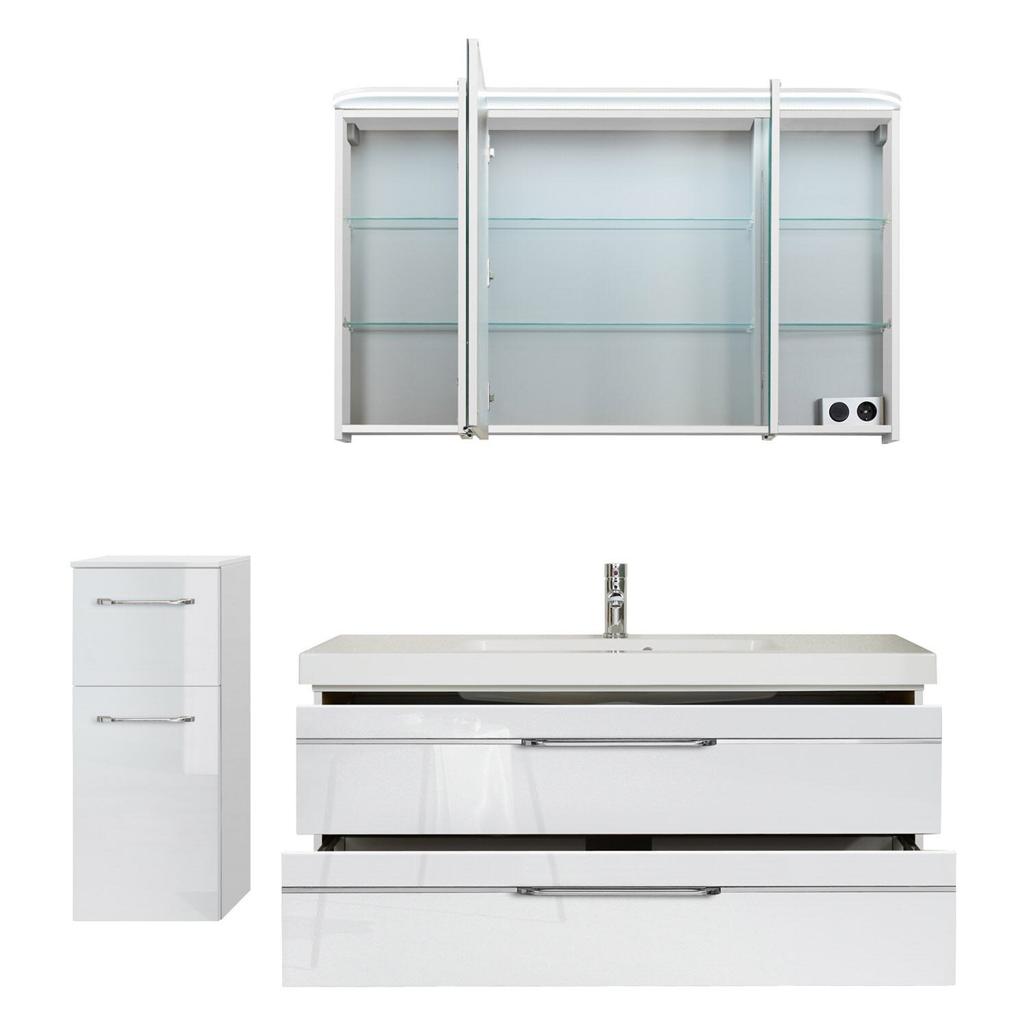 Neben genügend Stauraum verfügt der moderne Spiegelschrank über eine Schalter-Steckdosen-Einheit und einen LED-Lichtkranz, die den Waschplatz in ein optimales Licht setzen. Durch die Türdämpfer schließen die Spiegeltüren komplett leise. Der Mineralmarmor-Waschtisch in weiß besteht aus langlebigem, natürlichem Material ohne Zusatzstoffe und überzeugt durch eine hochglänzende, pflegeleichte, kratzfeste und stabile Oberfläche. Sie hat eine geringe Wärmeleitfähigkeit und somit eine hohe Wärmekapazität. Der Waschtischunterschrank in weiß hochglanz, mit Chromeinlage, ist ein echter Hingucker und bietet mit zwei Auszügen viel Platz für diverse Badutensilien. Überzeugen auch Sie sich von Qualität in Ihrem eigenen Zuhause. Durch die hochwertige Verarbeitung sind die Möbel leicht zu reinigen und weniger anfällig für Feuchtigkeit. Unsere Unterschränke sind genauso praktisch wie stylisch! Auf seinen Glaseinlegeböden finden Pflegeprodukte, Kosmetikartikel und alles, was sonst noch einen geschlossenen Ablageort braucht, ein neues Zuhause. Unsere Unterschränke bieten ausreichend Stauraum und sorgen so für Ordnung im Badezimmer. Und ein ordentliches Bad erscheint optisch auch noch größer.