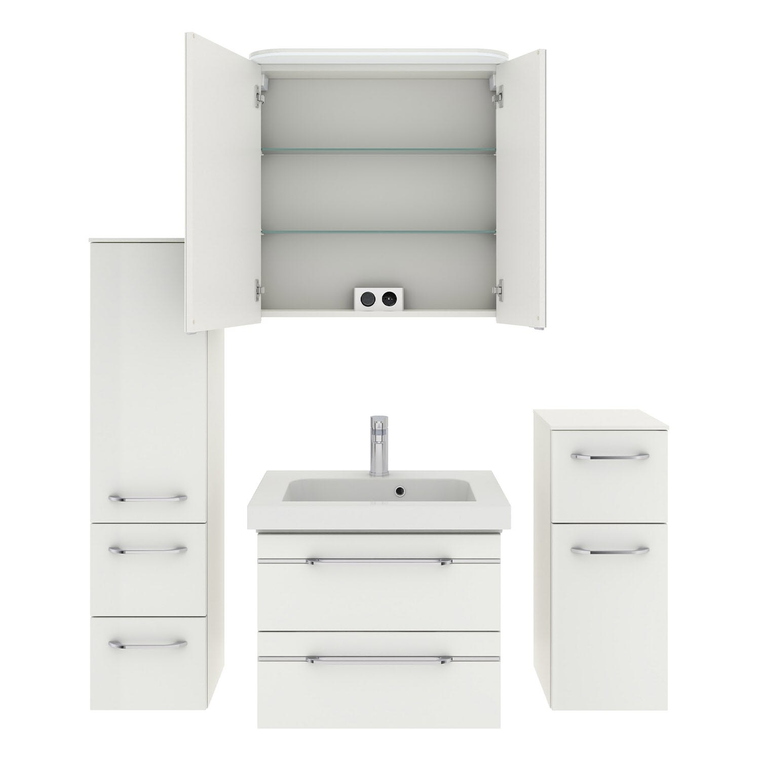Dieser Moderne Spiegelschrank hat zwei gedämpfte Spiegeltüren. Für eine optimale Organisation ist der Innenraum mit 2 Glaseinlegeböden und für die Steuerung mit einem Schalter/Steckdosenmodul ausgestattet. Für das perfekte Licht am Spiegel sorgt eine moderne und energiesparende LED-Kranzbeleuchtung. Durch die Türdämpfer schließen die Spiegeltüren komplett leise. Der Waschtischunterschrank in Weiß Hochglanz, mit Chromeinlage, ist ein echter Hingucker und bietet mit zwei Auszügen viel Platz für diverse Badutensilien. Überzeugen auch Sie sich von Qualität in Ihrem eigenen Zuhause. Durch die hochwertige Verarbeitung sind die Möbel leicht zu reinigen und weniger anfällig für Feuchtigkeit.Unsere Midischränke sind genauso praktisch wie stylisch ! Auf seinen Glaseinlegeböden finden Pflegeprodukte, Kosmetikartikel und alles, was sonst noch einen geschlossenen Ablageort braucht, ein neues Zuhause.Unsere Unterschränke bieten ausreichend Stauraum und sorgen so für Ordnung im Badezimmer. Und ein ordentliches Bad erscheint optisch auch noch größer.