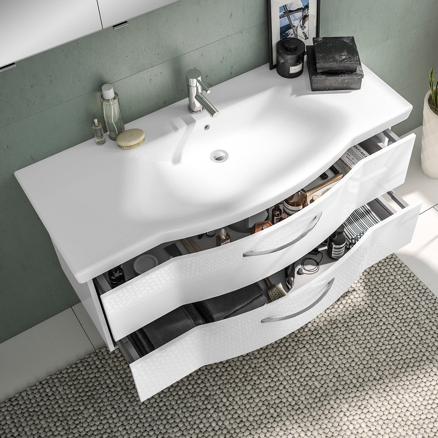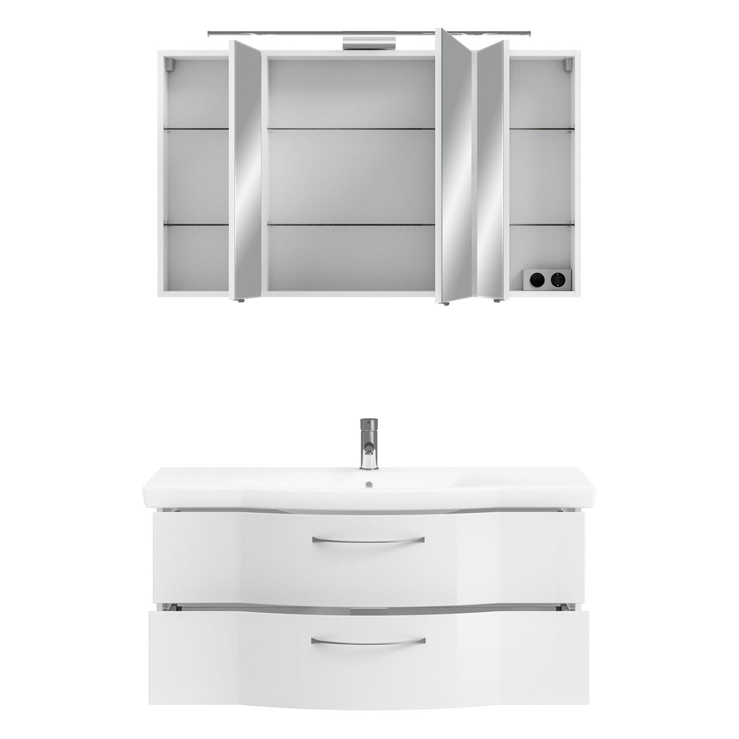 Neben genügend Stauraum verfügt der moderne Spiegelschrank über eine Schalter-Steckdosen-Einheit und eine LED-Aufsatzleuchte, die den Waschplatz in ein optimales Licht setzen. Durch die Türdämpfer schließen die Spiegeltüren komplett leise. Der Mineralmarmor-Waschtisch in weiß besteht aus langlebigem, natürlichem Material ohne Zusatzstoffe und überzeugt durch eine hochglänzende, pflegeleichte, kratzfeste und stabile Oberfläche. Die Waschtischunterschränke sind mit geräumigen, leichtlaufenden Schubkästen und dazugehörigen schönen chromglänzenden Griffen ausgestattet, die bei der täglichen Ordnung im Bad unersetzlich sind. Der Unterschrank verbirgt viele Utensilien des Alltags. Praktisch und schick in modernem Weiß Hochglanz.