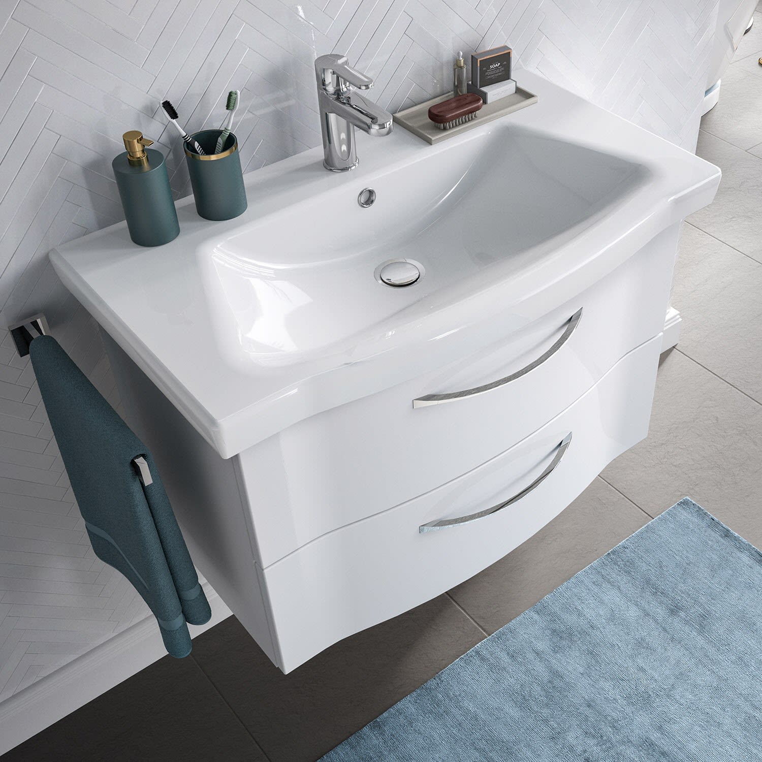 Das vielseitige Bad-Set überzeugt durch klare Linien und durchdachte Details: Der weiße Keramikwaschtisch mit Überlauf und Armaturbohrung passt perfekt zum Waschtischunterschrank mit zwei Auszügen in weiß hochglanz. Der Spiegelschrank mit LED-Aufsatzleuchte, Facettenschliff und zwei Glaseinlegeböden bietet Licht und Ordnung. Der Midischrank mit Drehtür, zwei Auszügen und Glaseinlegeböden ergänzt das Set optimal und schafft zusätzlichen Stauraum. Integrierte Steckdose und Schalter sorgen für praktischen Komfort.