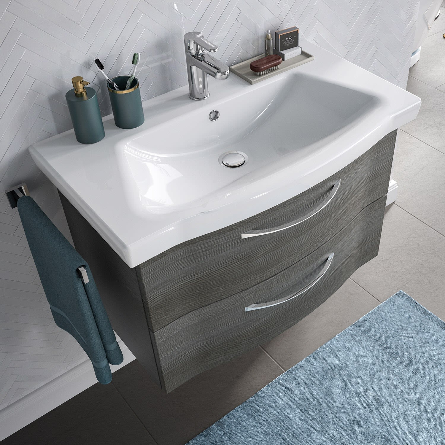 Das Bad-Set überzeugt durch seine Kombination aus hochwertigem MDF-Material, pflegeleichten Oberflächen und Softclose-Technologie. Der weiße Keramikwaschtisch mit integriertem Überlauf und Armaturbohrung ist funktional und leicht zu reinigen. Der Waschtischunterschrank und Midischrank bieten mit Softclose-Auszügen und Tür ein geräuscharmes Handling. Der Spiegelschrank mit LED-Aufsatzleuchte, Facettenschliff und zwei Glaseinlegeböden ist mit Schalter und Steckdose ausgestattet. Ein robustes, elegantes Set für moderne Badezimmer.