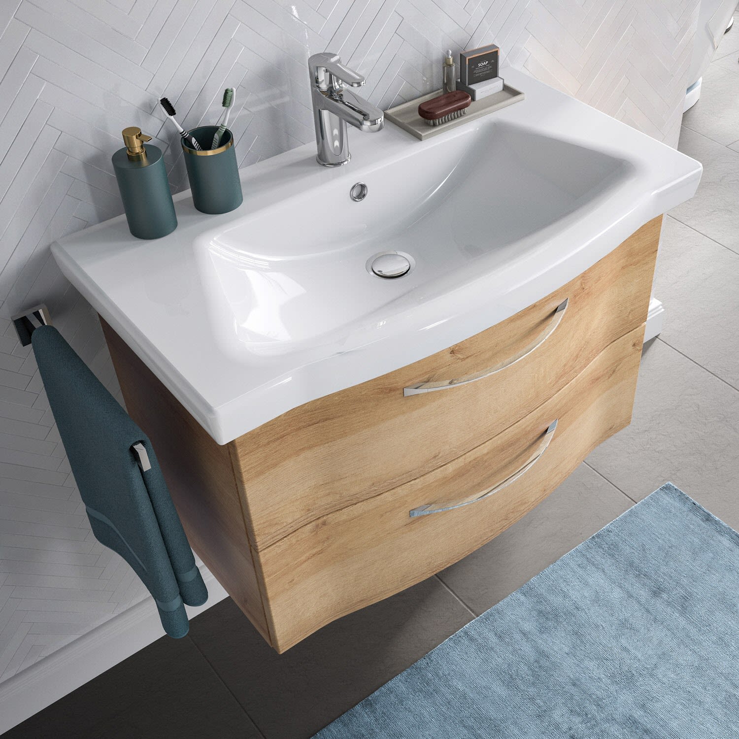 Neben genügend Stauraum verfügt der moderne Spiegelschrank in weiß glanz, über eine Schalter-Steckdosen-Einheit und eine LED-Aufsatzleuchte, die den Waschplatz in ein optimales Licht setzen. Durch die Türdämpfer schließen die Spiegeltüren komplett leise.Der weiße Waschtisch steht für qualitative Markenkeramik. Der Waschtischunterschrank überzeugt durch Oberflächen, die mit einer hochwertigen Folie veredelt sind und dem Möbelstück ein besonders ansprechendes Dekor verleihen. Die Innenseiten der Möbel sind melaminbeschichtet und damit leicht zu reinigen und weniger feuchtigkeitsanfällig. Die Waschtischunterschränke sind mit geräumigen und leichtlaufenden Schubkästen und dazugehörigen schönen chromglänzenden Griffen ausgestattet, die bei der täglichen Ordnung im Bad unersetzlich sind. Ein Auszug und eine Drehtür mit Einlegeboden bieten im freihängendem Midischrank viel Platz für Badutensilien.