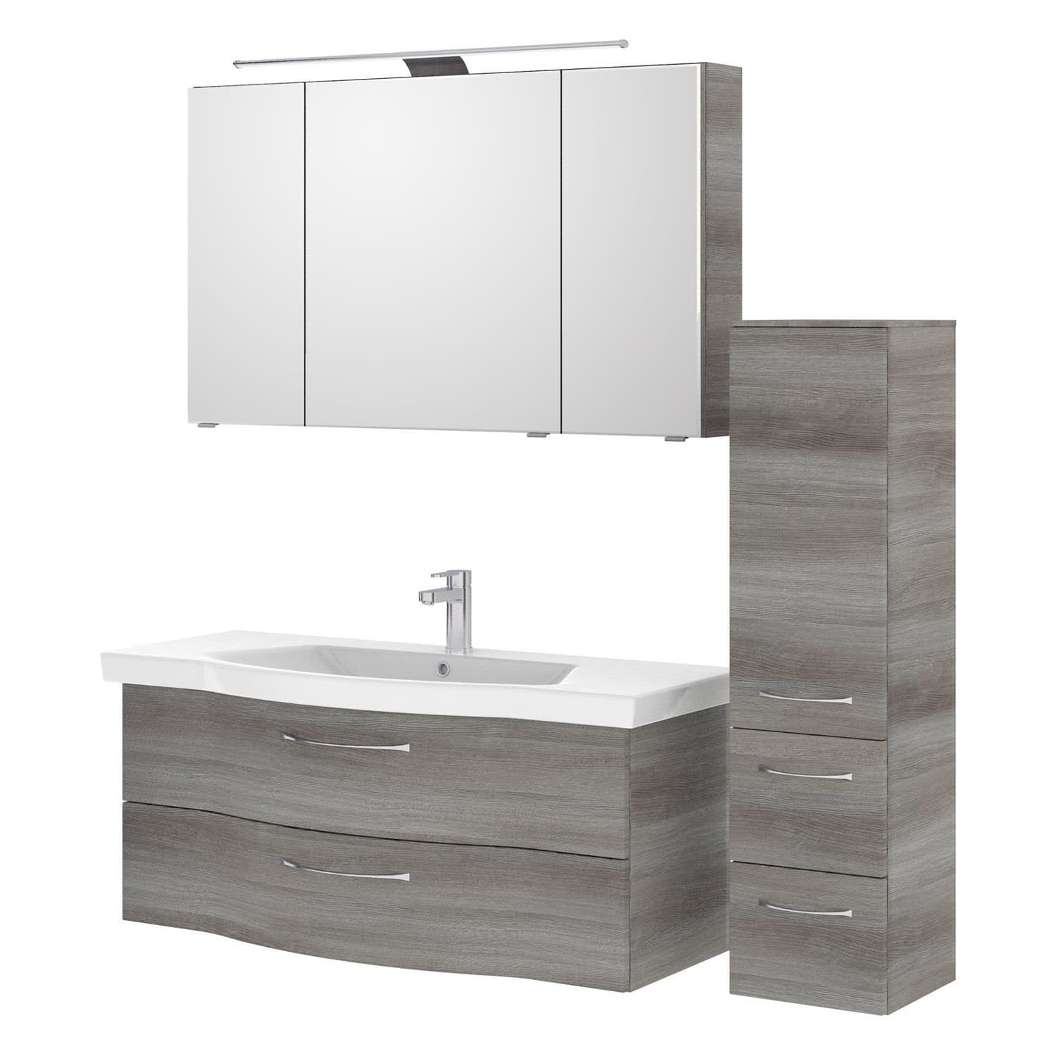 Der Spiegelschrank des Badmöbelprogramms hat drei Spiegeltüren. Für eine optimale Organisation ist der Innenraum mit 6 Einlegeböden und für die Steuerung mit einem Schalter/Steckdosenmodul ausgestattet. Für das perfekte Licht am Spiegel sorgt eine moderne und energiesparende LED-Aufsatzleuchte. Hochwertige Keramik, klare Linienführung. Der weiße Waschtisch steht für qualitative Markenkeramik. Schwungvoll elegant. Der Waschtischunterschrank ist ein echter Hingucker und bietet mit zwei Auszügen viel Platz für diverse Badutensilien. Mit einer Drehtür und einem Auszug bietet der Midischrank optimalen Stauraum für Großes und Kleines.