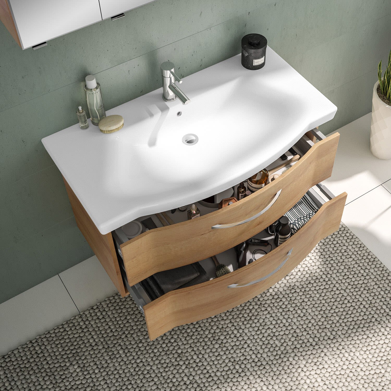 Das Multitalent macht auch vor den Spiegelschränken, dem Mittelpunkt eines Badezimmers, nicht halt. Eine hochwertige Ausstattung mit modernen LED-Aufsatzleuchten, drei Spiegeltüren und einem Stecker/Schaltermodul überzeugt jeden Tag bei der Schönheitspflege. Der weiße Waschtisch steht für qualitative Markenkeramik. Der Waschtischunterschrank überzeugt durch Oberflächen, die mit einer hochwertigen Folie veredelt sind und dem Möbelstück ein besonders ansprechendes Dekor verleihen. Die Innenseiten der Möbel sind melaminbeschichtet und damit leicht zu reinigen und weniger feuchtigkeitsanfällig. Die Waschtischunterschränke sind mit geräumigen und leichtlaufenden Schubkästen und dazugehörigen schönen chromglänzenden Griffen ausgestattet, die bei der täglichen Ordnung im Bad unersetzlich sind.Der freihängende Unterschrank bietet zusätzlichen Stauraum und lässt Platz für dekorative Accessoires. Mit einer Drehtür und einem Auszug bietet der Midischrank optimalen Stauraum für Großes und Kleines.