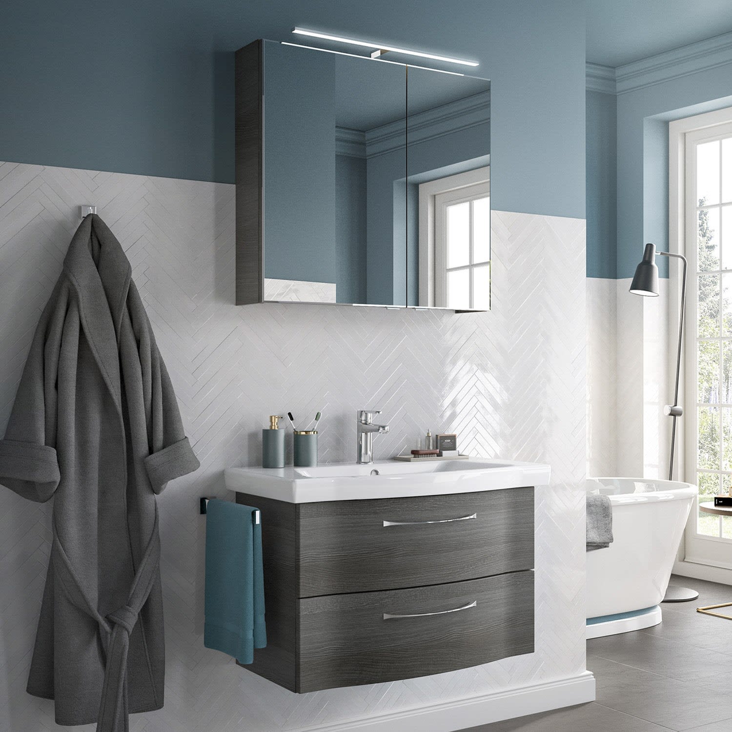 Dieses Badset verbindet modernes Design mit höchster Funktionalität. Der weiße Keramikwaschtisch mit integriertem Überlauf und Armaturbohrung ist besonders pflegeleicht. Der Waschtischunterschrank mit zwei Auszügen überzeugt durch eine hochwertige Front und das geräuscharme Softclose-System. Der Spiegelschrank mit LED-Aufsatzleuchte, zwei verspiegelten Drehtüren mit Facettenschliff und zwei Glaseinlegeböden bietet nicht nur viel Stauraum, sondern auch eine praktische Schalter- und Steckdosenfunktion. Pflegeleicht, langlebig und stilvoll - perfekt für Ihr modernes Badezimmer.