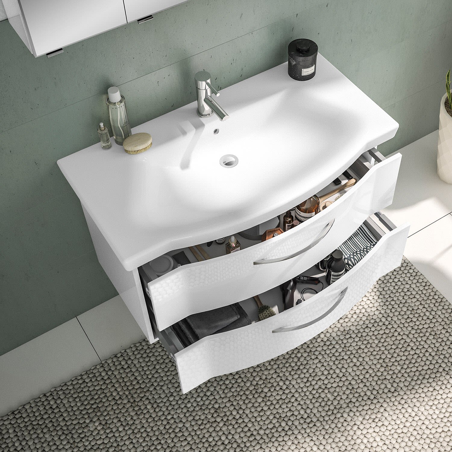 Neben genügend Stauraum verfügt der moderne Spiegelschrank in weiß glanz, über eine Schalter-Steckdosen-Einheit und eine LED-Aufsatzleuchte, die den Waschplatz in ein optimales Licht setzen. Durch die Türdämpfer schließen die Spiegeltüren komplett leise. Der weiße Waschtisch steht für qualitative Markenkeramik. Ein Raumwunder unter dem Waschtisch: Mit zwei praktischen Auszügen finden Badschätze hier Platz.Die Oberflächen dieser schönen Dekore werden mit einer hochwertigen Folie überzogen. Die Innenseiten der Möbel sind melaminbeschichtet und damit leicht zu reinigen und weniger feuchtigkeitsanfällig.