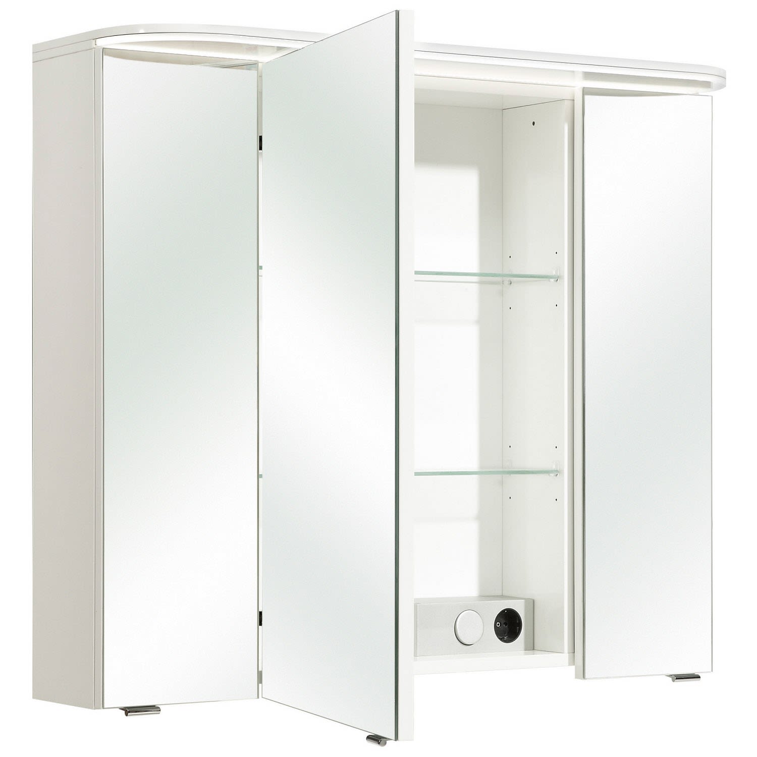 Die Kranzbeleuchtung des zeitlosen, modernen Spiegelschranks Balto bietet angenehmes Licht. Im Inneren finden viele kleine Utensilien ihren Platz. Der formschöne Lichtkranz mit LED-Technik fügt sich nahtlos an den praktischen Spiegelschrank an. Er ist mit 3 Türen und 6 Einlegeböden ausgestattet und bietet somit großzügigen Stauraum für Ihre Badutensilien. Im Inneren befindet sich auch eine praktische Schalter/Steckdosenkombination, die eine einfache Handhabung des Föns & Co. ermöglicht.