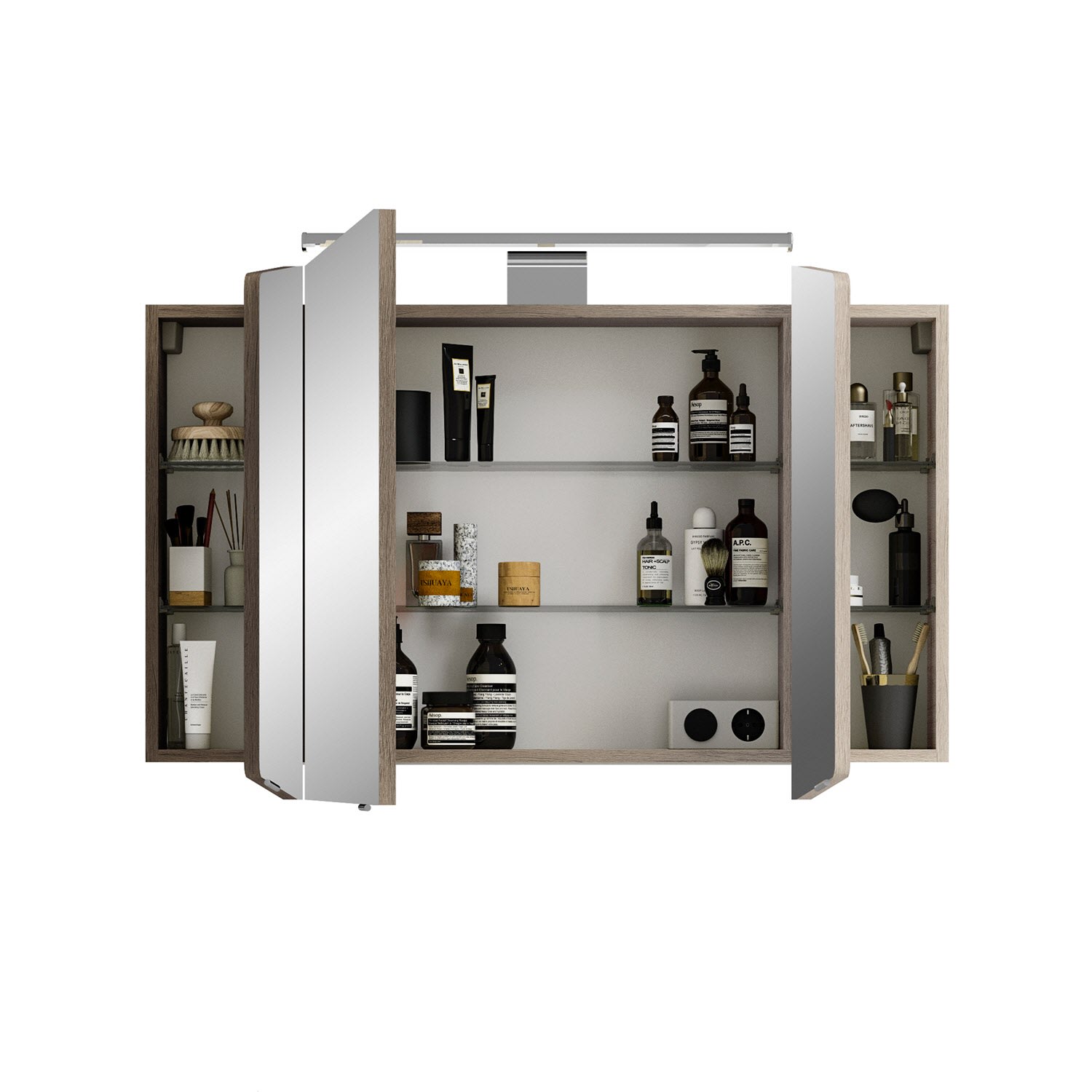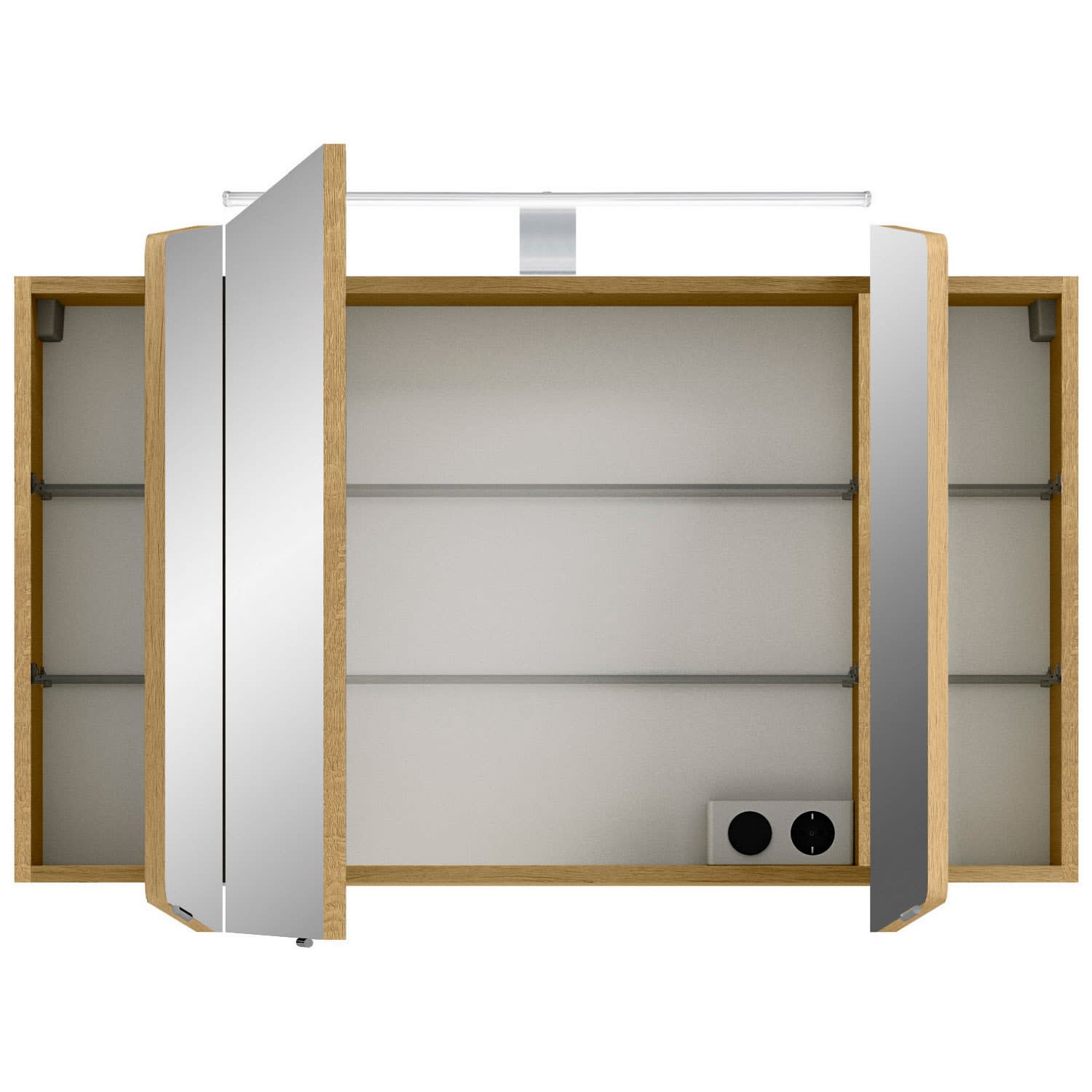 Der Spiegelschrank Cassca hat 3 Spiegeltüren. Für eine optimale Organisation ist der Innenraum mit 6 Einlegeböden und für die Steuerung mit einem Schalter/Steckdosenmodul ausgestattet. Für das perfekte Licht sorgt eine moderne und energiesparende LED-Aufsatzleuchte.