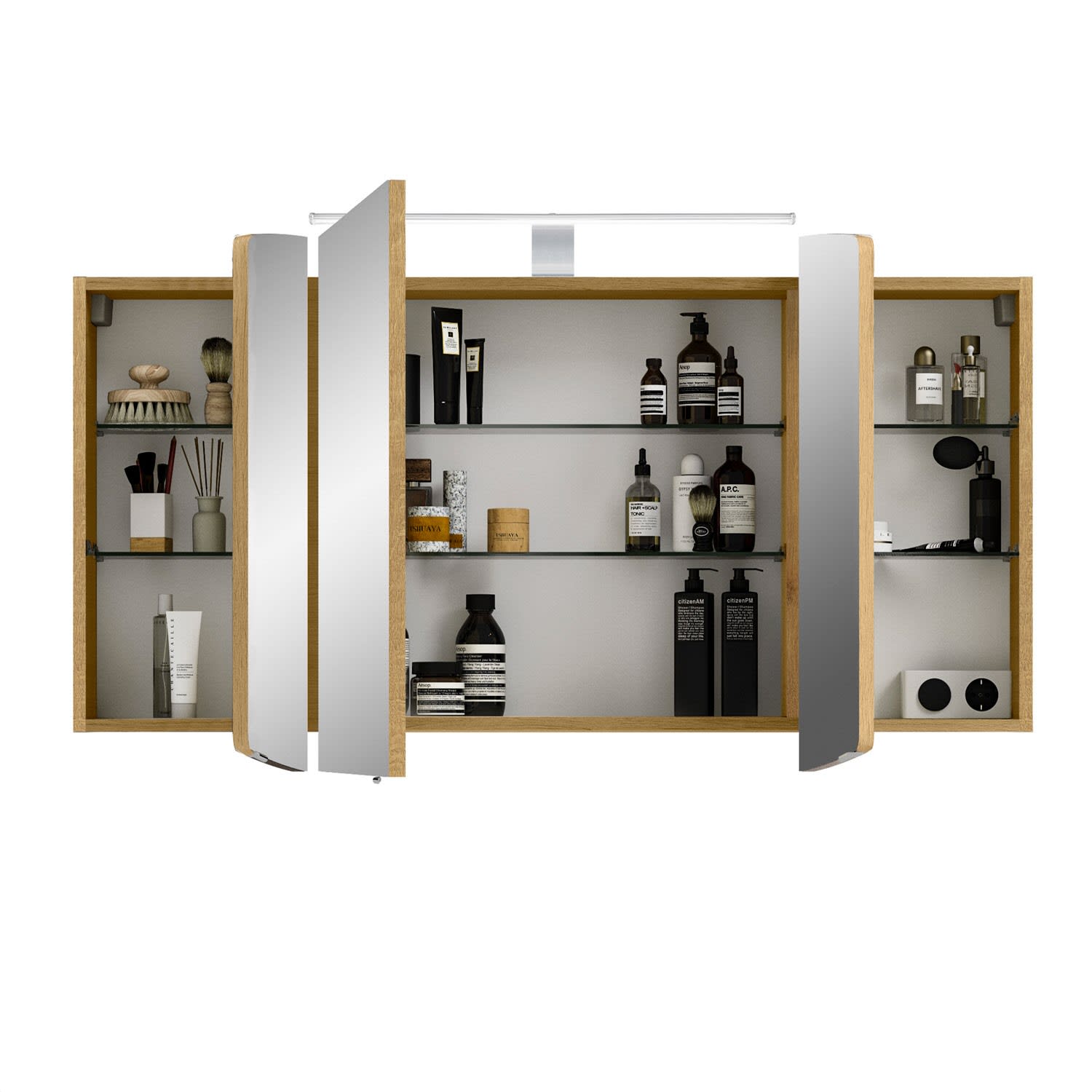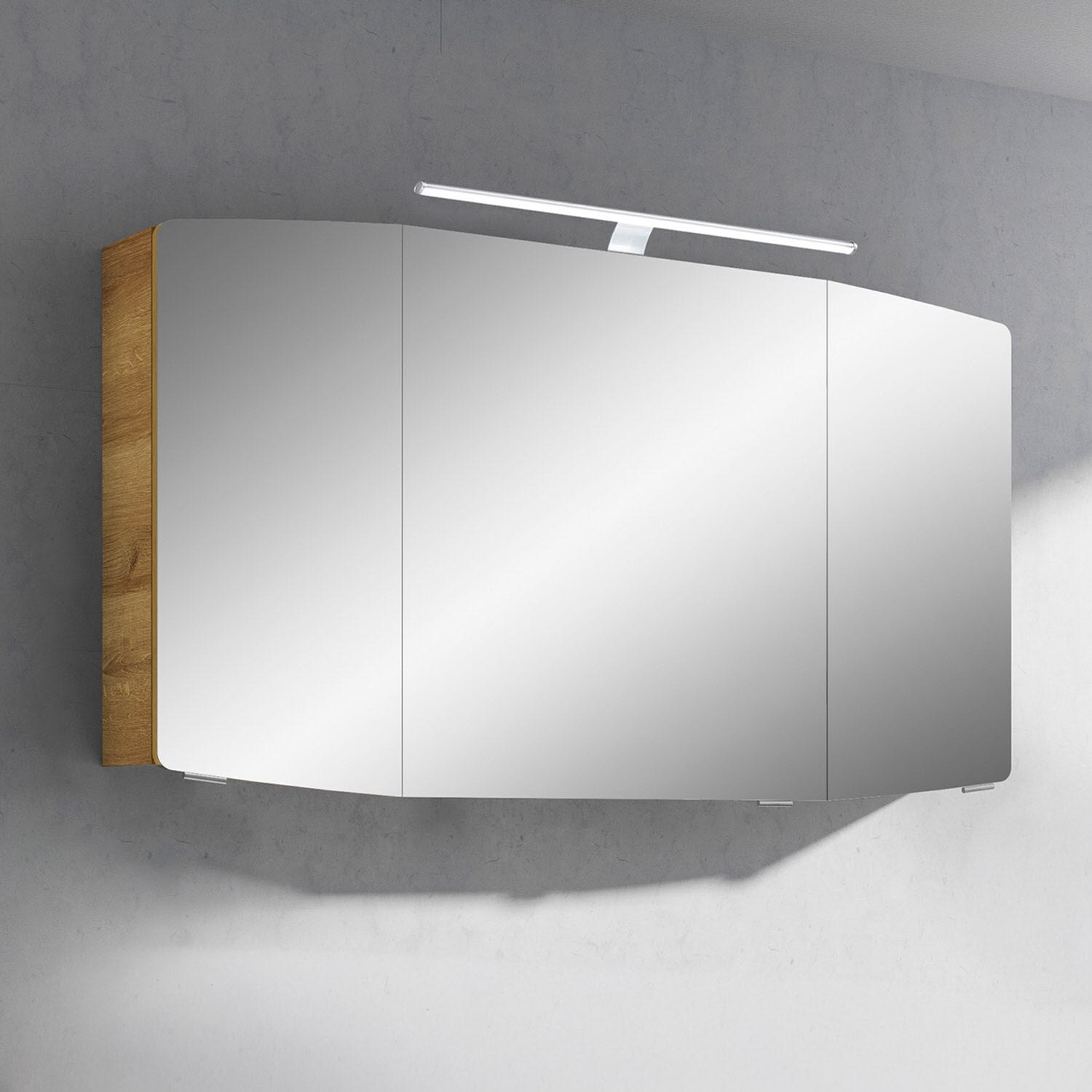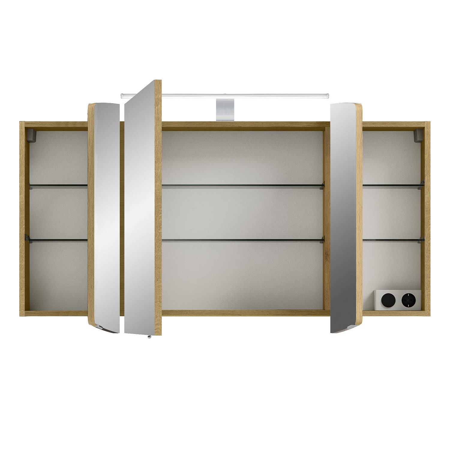 Der Spiegelschrank Cassca ist der ideale Aufbewahrungsort für diverse Kosmetikartikel, Haarbürsten und Badutensilien. Er ist mit 3 Türen und 6 Einlegeböden ausgestattet und bietet somit einen großzügigen Stauraum. Im Inneren befindet sich eine praktische Schalter/Steckdosenkombination, die eine einfache Handhabung von Fön & Co. ermöglicht. Für das perfekte Licht sorgt eine moderne und energiesparende LED-Aufsatzleuchte.