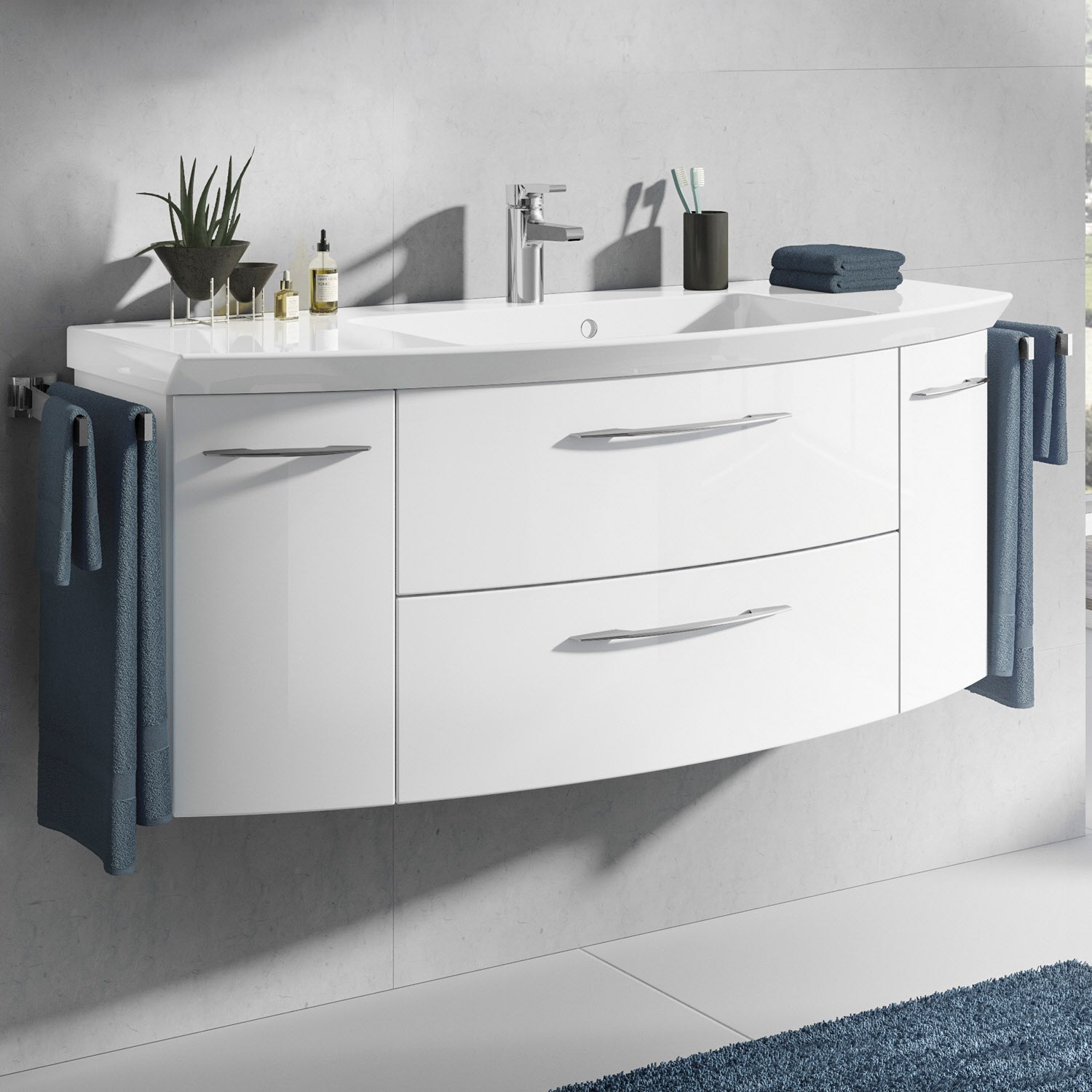 Der schwungvoll elegante Waschtisch Cassca ist aus Mineralmarmor gefertigt. Ein natürliches, langlebiges Material ohne Zusatzstoffe. Die Oberfläche ist pflegeleicht, kratzfest und bruchsicher. Sie hat eine geringe Wärmeleitfähigkeit und somit eine hohe Wärmekapazität. Der Waschtischunterschrank ist ein echter Hingucker und bietet mit 2 Auszügen und 2 Drehtüren viel Platz für diverse Badutensilien. Die Oberflächen werden mit einer hochwertigen Folie überzogen und die Innenseiten sind melaminbeschichtet. Durch die qualitativ hochwertige Verarbeitung sind die Möbel leicht zu reinigen und weniger anfällig für Feuchtigkeit.