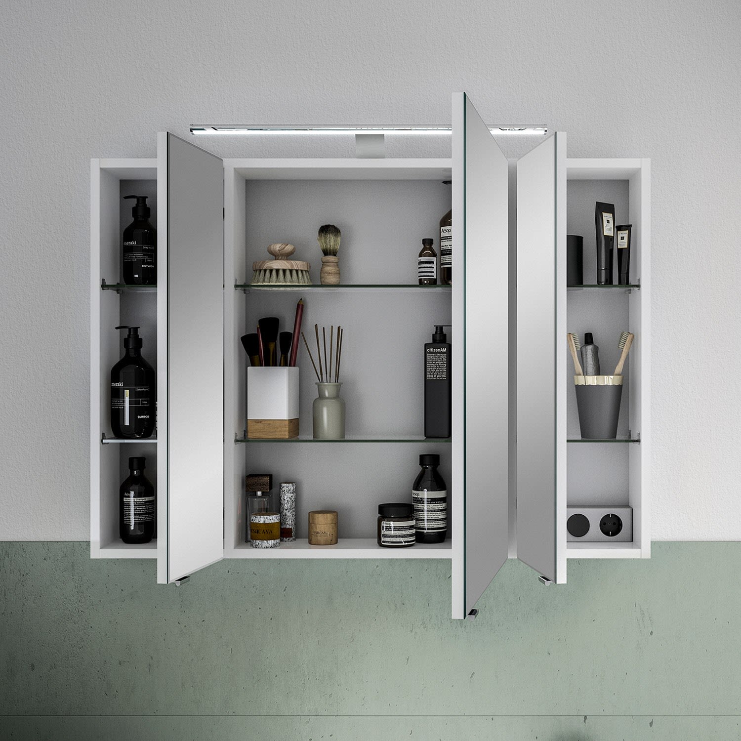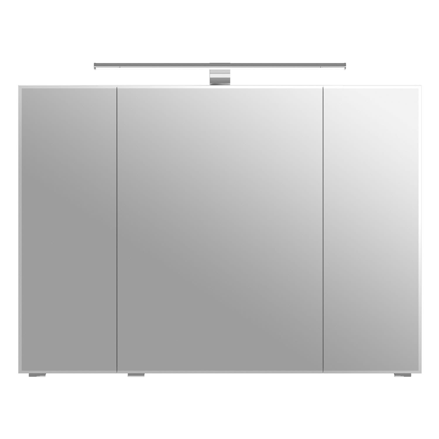 Dieser stilvolle Spiegelschrank vereint zeitloses Design mit hoher Funktionalität. Die LED-Aufsatzleuchte sorgt für angenehme Lichtverhältnisse, 3 Drehtüren mit Facettenschliff und hochwertige Glaseinlegeböden bieten viel Platz für Ihre Badutensilien. Mit integriertem Schalter und Steckdose ist der Spiegelschrank ideal für moderne Badgestaltungen.
