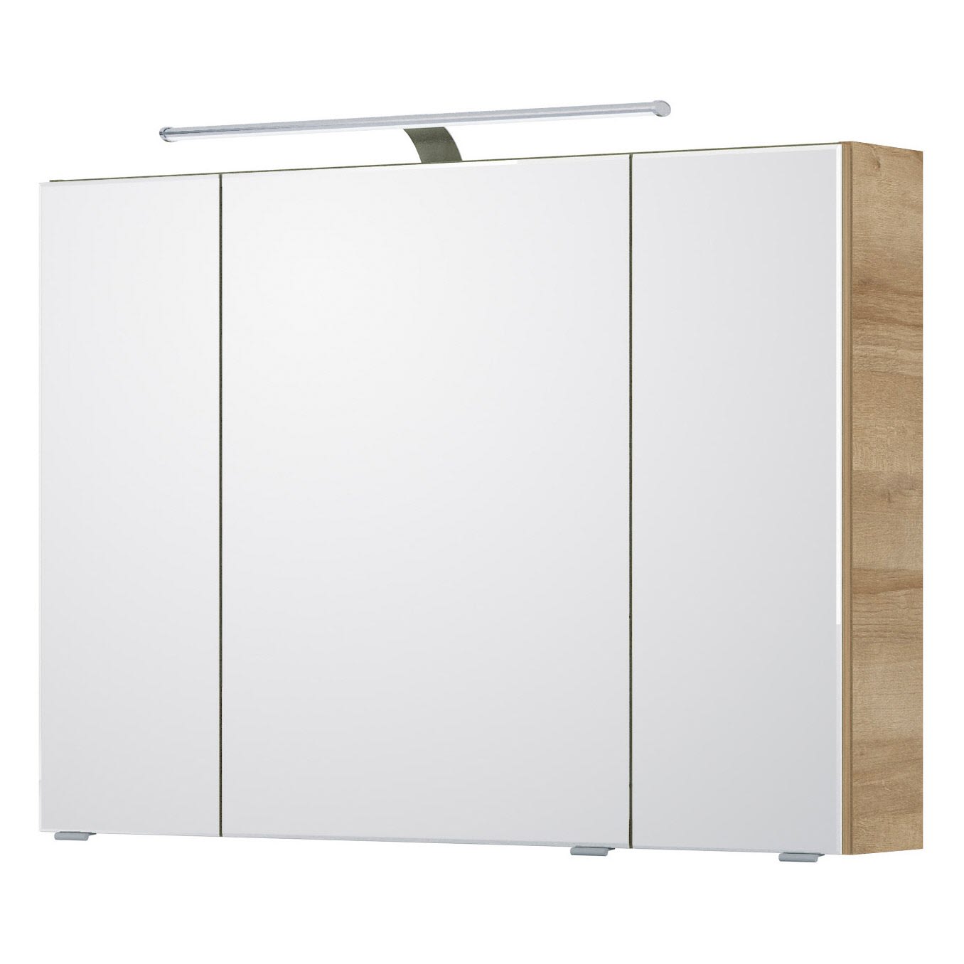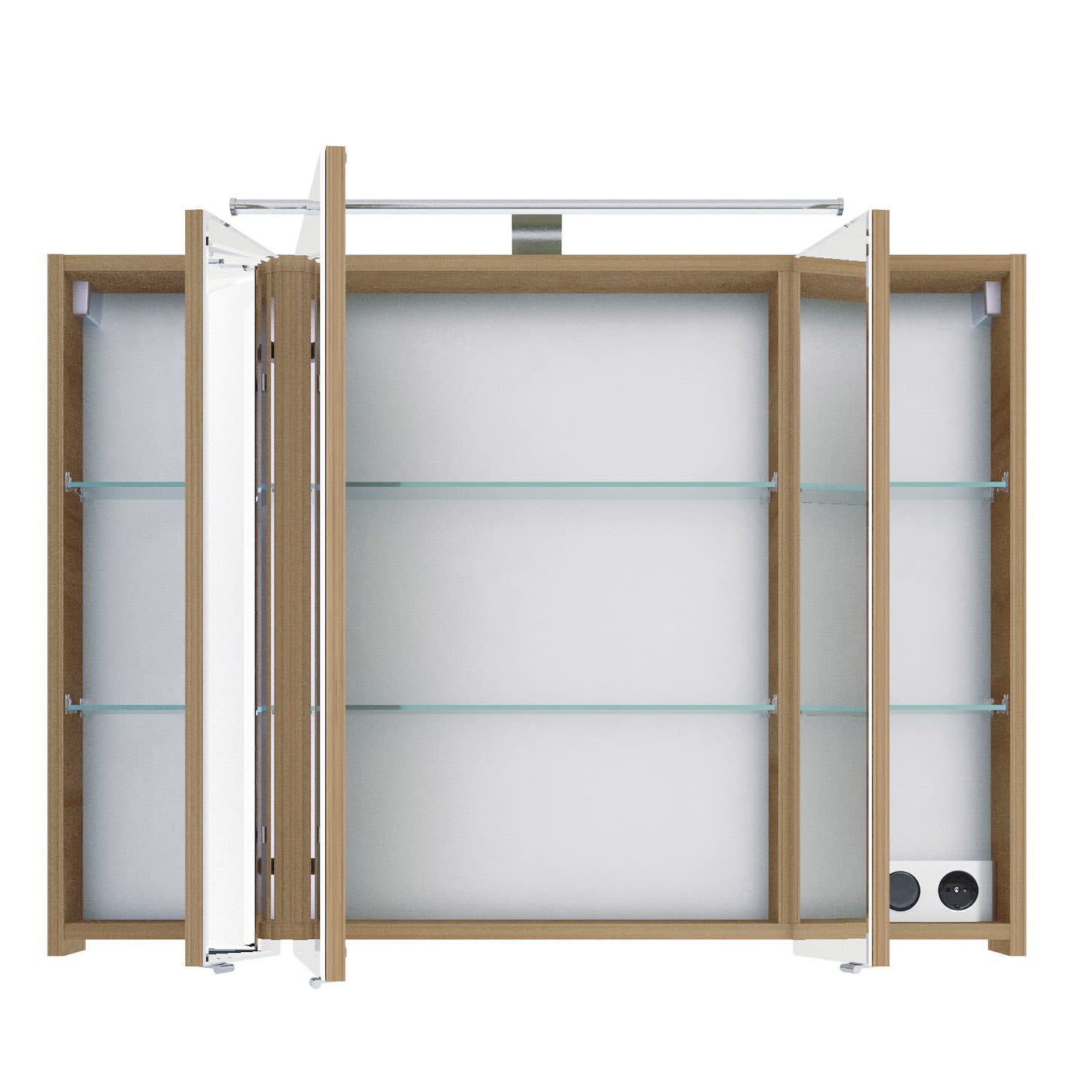 Dieser stilvolle Spiegelschrank vereint zeitloses Design mit hoher Funktionalität. Die LED-Aufsatzleuchte sorgt für angenehme Lichtverhältnisse, 3 Drehtüren mit Facettenschliff und hochwertige Glaseinlegeböden bieten viel Platz für Ihre Badutensilien. Mit integriertem Schalter und Steckdose ist der Spiegelschrank ideal für moderne Badgestaltungen.