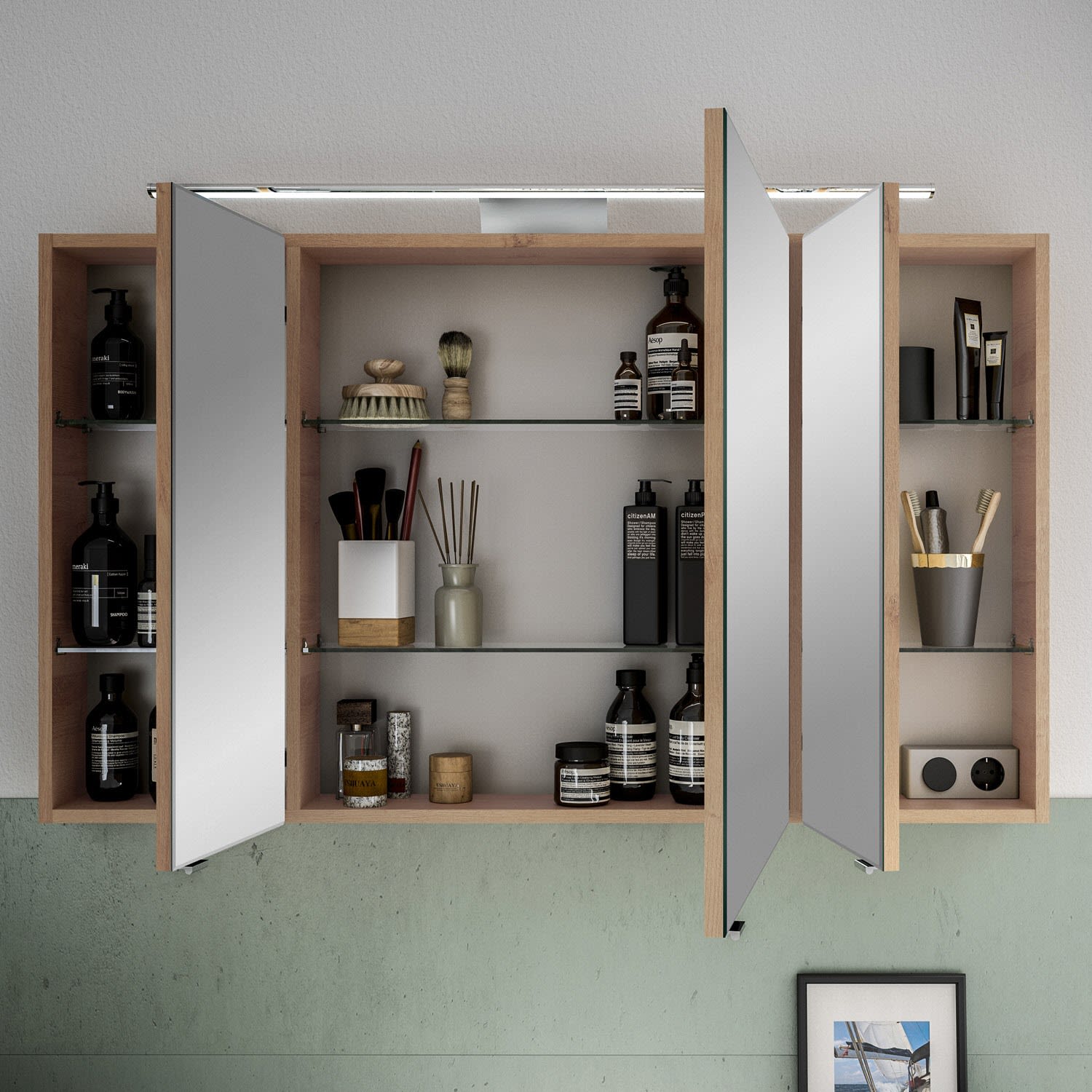 Dieser stilvolle Spiegelschrank vereint zeitloses Design mit hoher Funktionalität. Die LED-Aufsatzleuchte sorgt für angenehme Lichtverhältnisse, 3 Drehtüren mit Facettenschliff und hochwertige Glaseinlegeböden bieten viel Platz für Ihre Badutensilien. Mit integriertem Schalter und Steckdose ist der Spiegelschrank ideal für moderne Badgestaltungen.