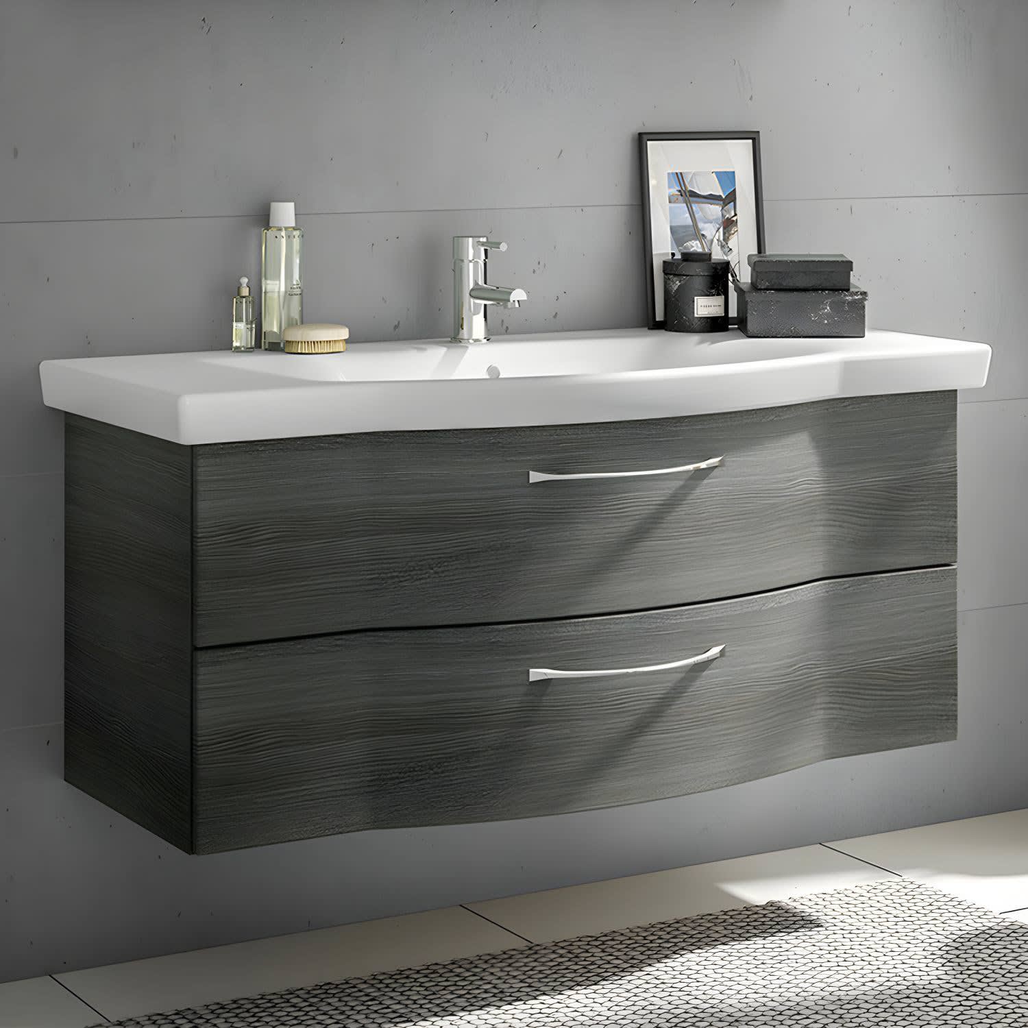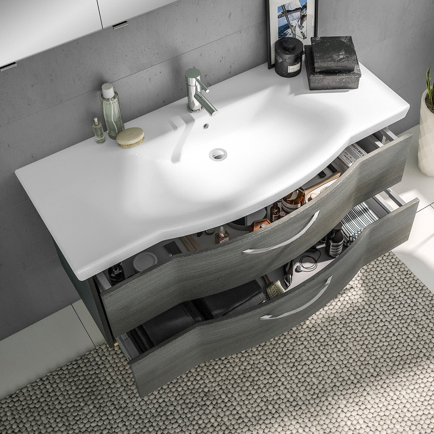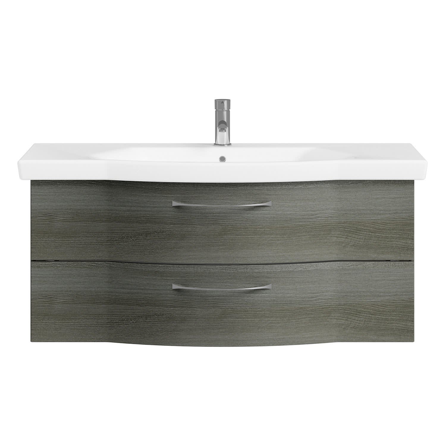 Natürlich schön und funktional - ein modernes Badset für stilvolle Bäder. Der Keramikwaschtisch bietet mit Armaturbohrung und integriertem Überlauf hohe Funktionalität. Ergänzt wird er durch einen Unterschrank mit 2 praktischen Auszügen mit Softclose. Der Korpus ist aus robustem MDF-Material. Die pflegeleichte, mit hochwertiger Folie überzogene, Oberfläche der Fronten sowie die melaminbeschichteten Innenseiten sind leicht zu reinigen und weniger feuchtigkeitsanfällig.