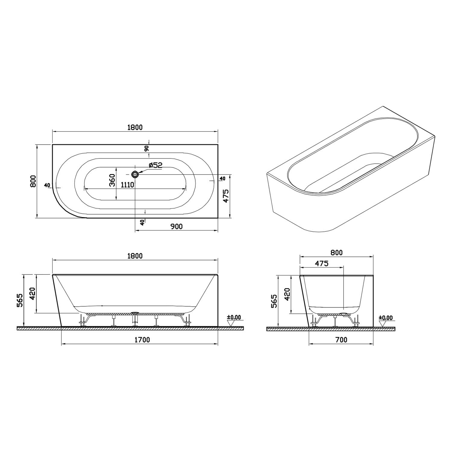 pianura Valentina Eckbadewanne 180 x 80 cm Ecke rechts