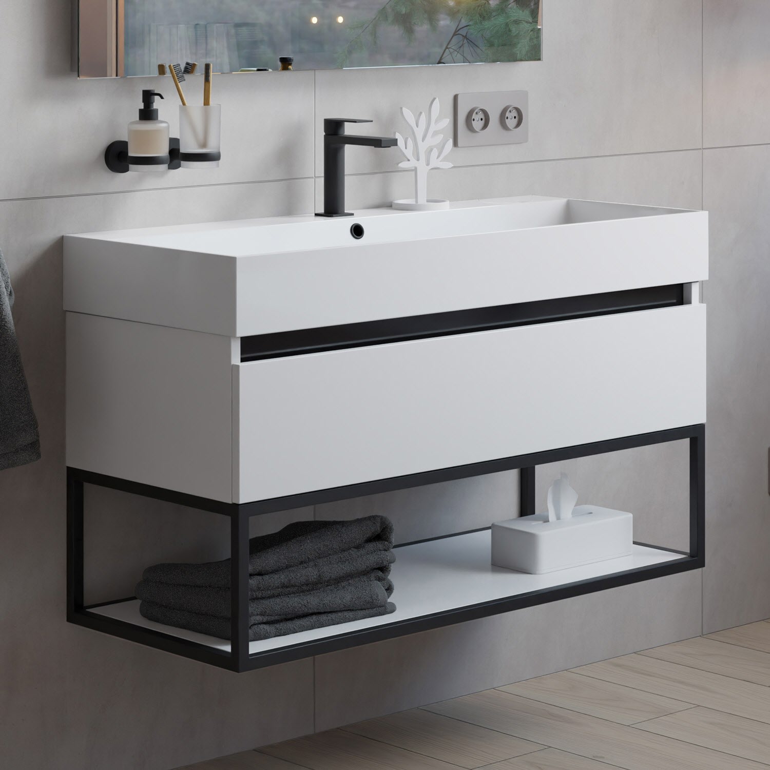 Sanipa 3way Unterschrank 100 cm, 2 Auszüge, Aufsatz-Griffe schwarz matt mit Villeroy & Boch Finion Waschtisch