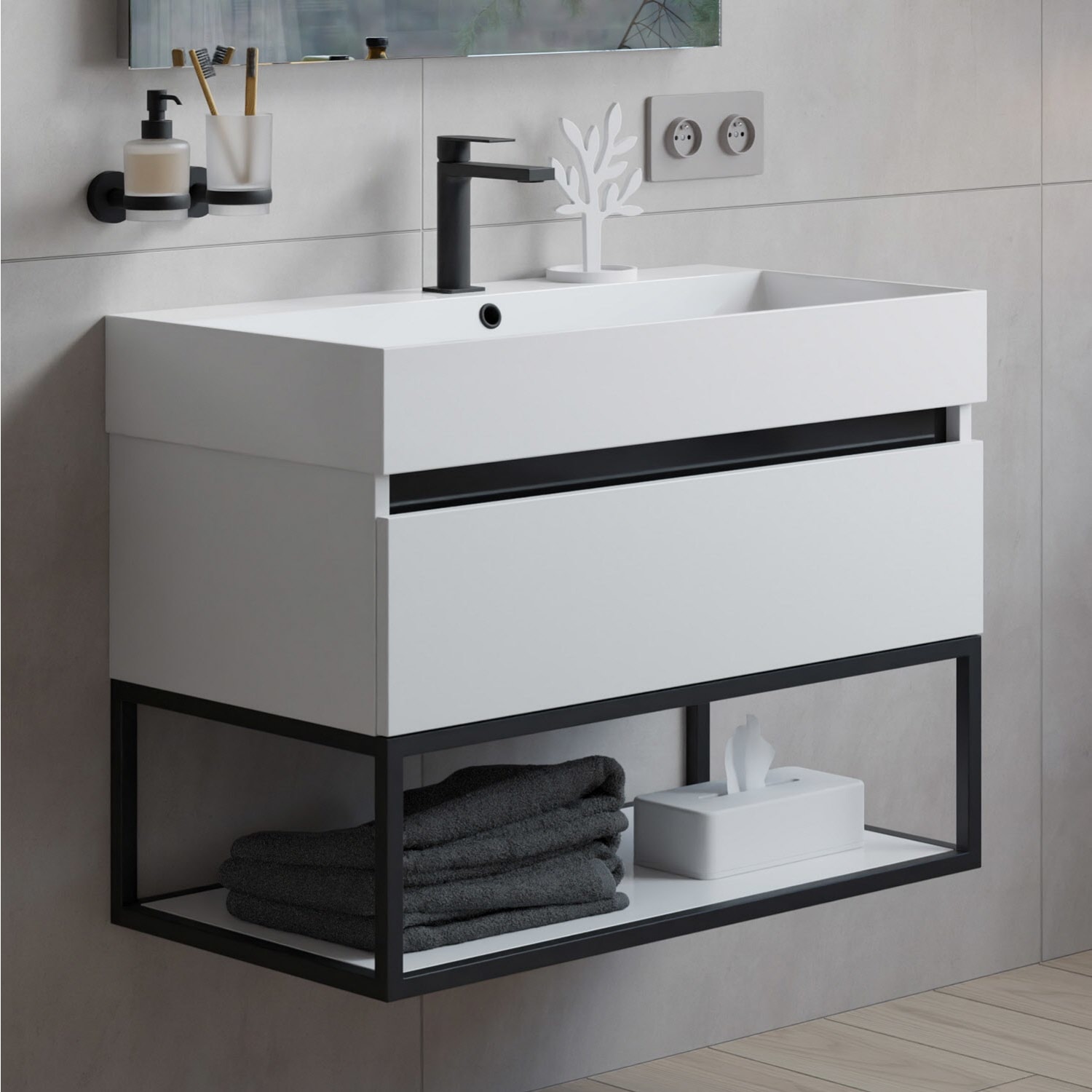 Sanipa Solo One Angular Keramik-Set 80 cm mit Keramik-Waschtisch und Waschtischunterbau mit 2 Auszügen