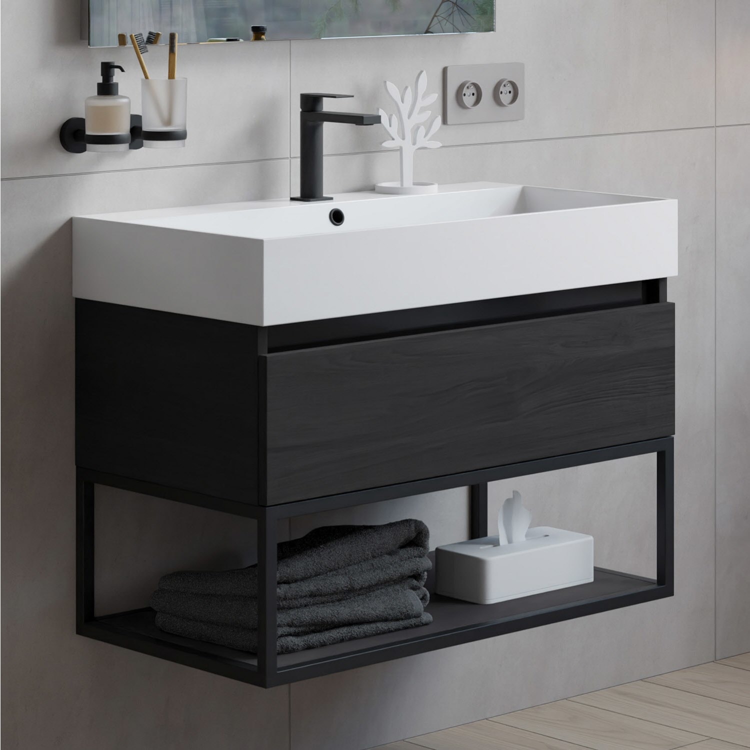 Sanipa Solo One Angular Keramik-Set 80 cm mit Keramik-Waschtisch und Waschtischunterbau mit 2 Auszügen