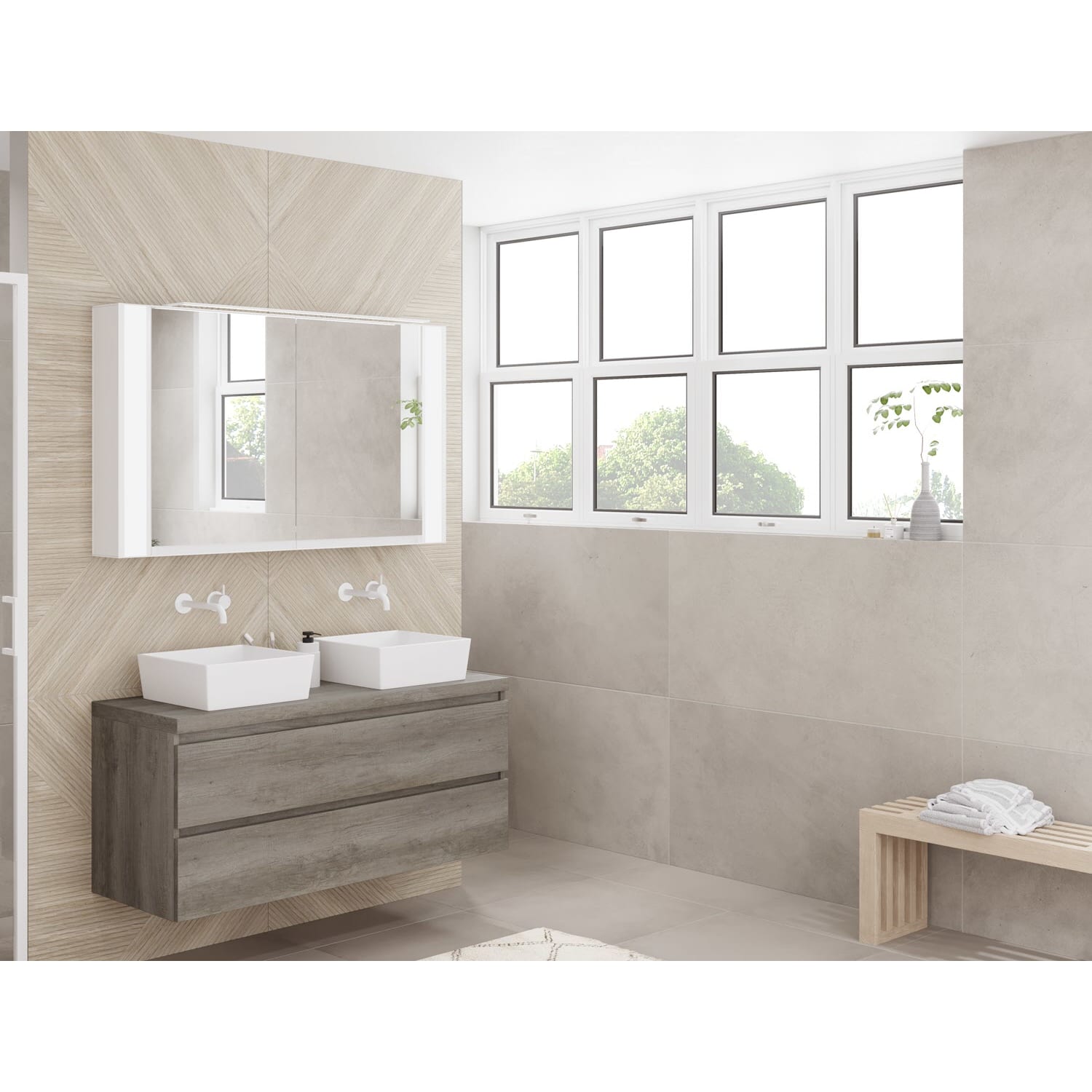 Hinweis: Der LED-Spiegelschrank und die Waschtischkombination aus diesem Set sind auch einzeln in unserem Sortiment erhältlich.