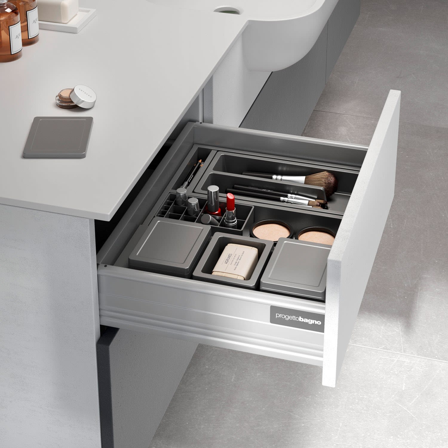 Mit der praktischen Accessory Box gelingt Ordnung im Waschtischunterschrank. Passend für den unteren Auszug finden hier Badutensilien wie Zahnpasta oder -bürsten, Creme oder Lotion ihren