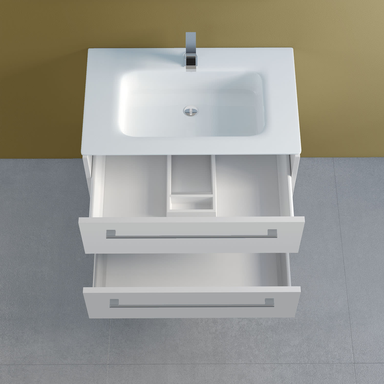 - 1 Schublade oben mit Siphonausschnitt und Inneneinteilung
