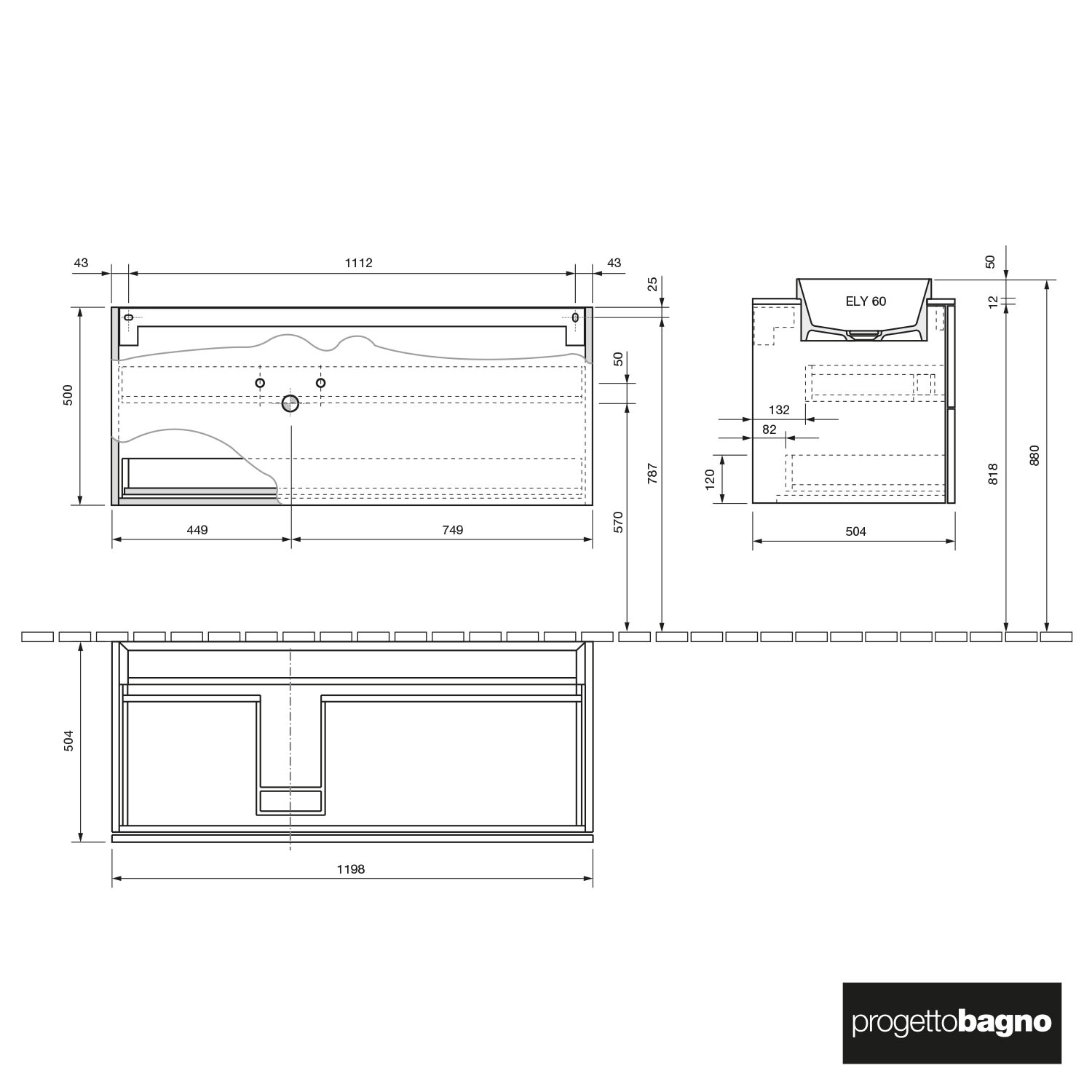 progettobagno Elba Unterschrank 120 cm, Ausführung links mit Glasplatte ohne Hahnlochbohrung und ELY 60 Einbauwaschtisch