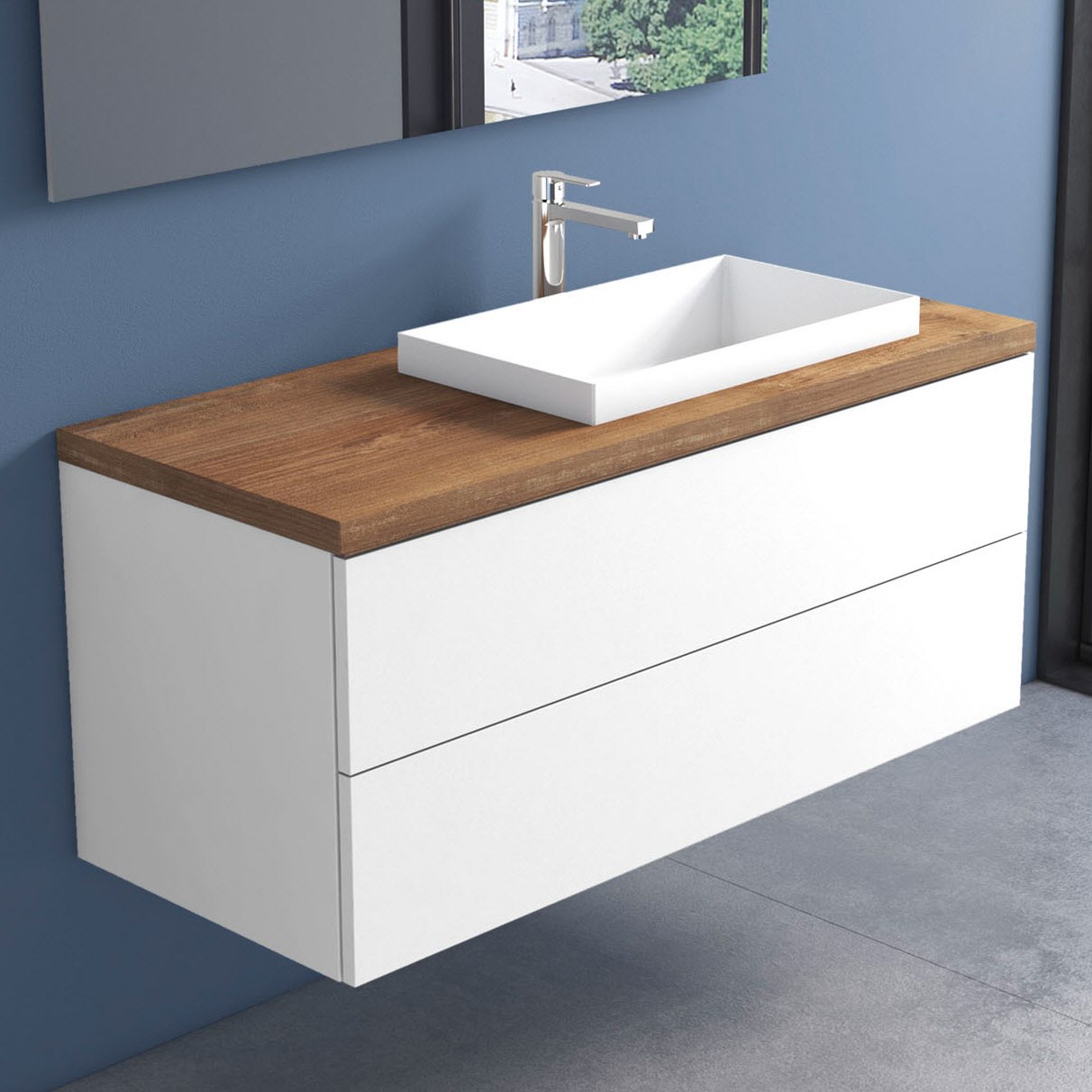 progettobagno Elba Terra Unterschrank 120 cm mit Platte in Holzdekor, Hahnlochbohrung und ELY 60 Einbauwaschtisch , Ausführung rechts