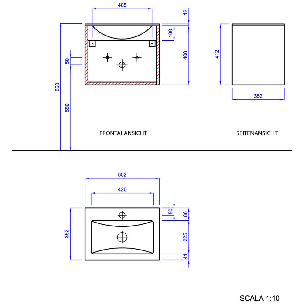- Waschtisch ohne Überlauf, aber mit Hahnloch für Einlochmischer