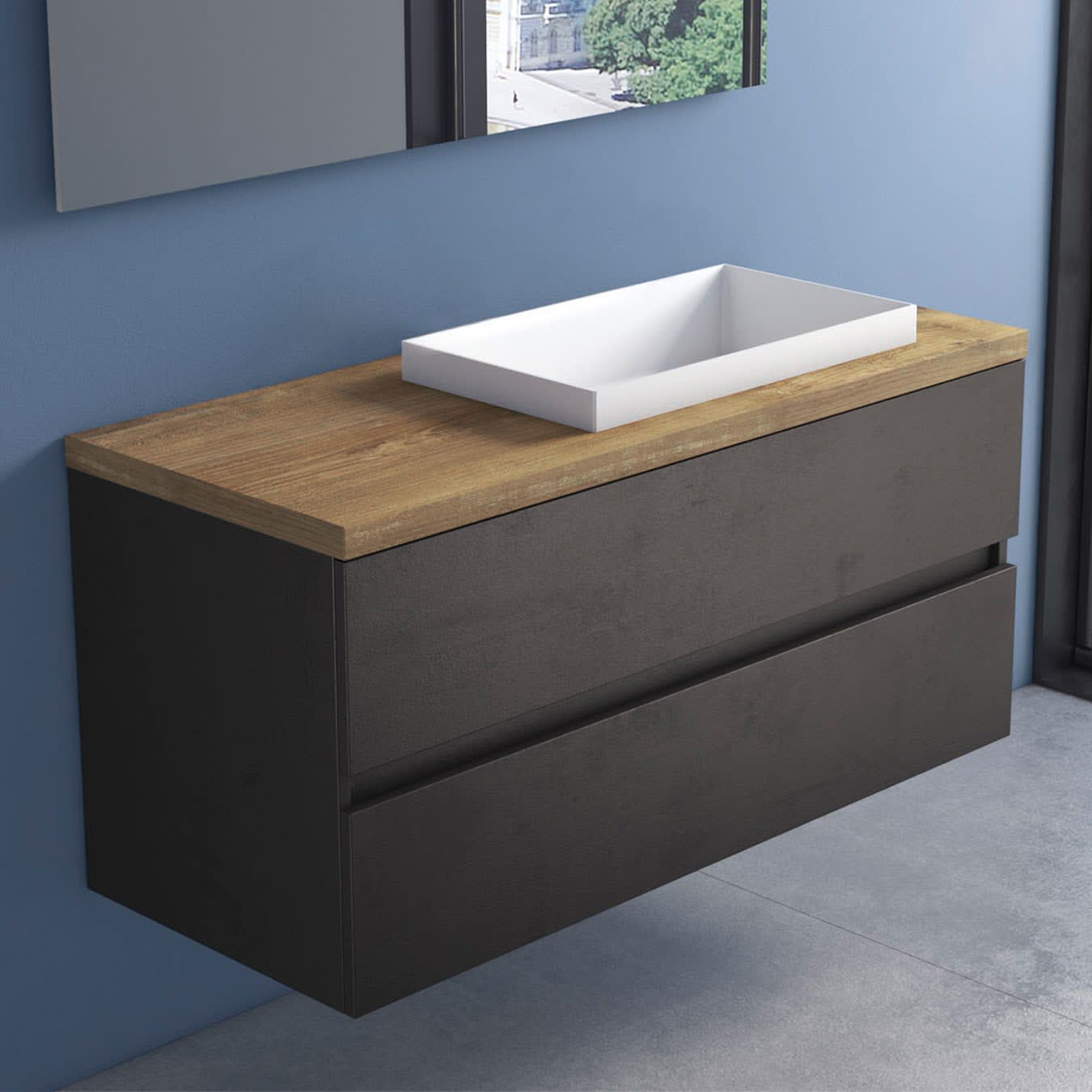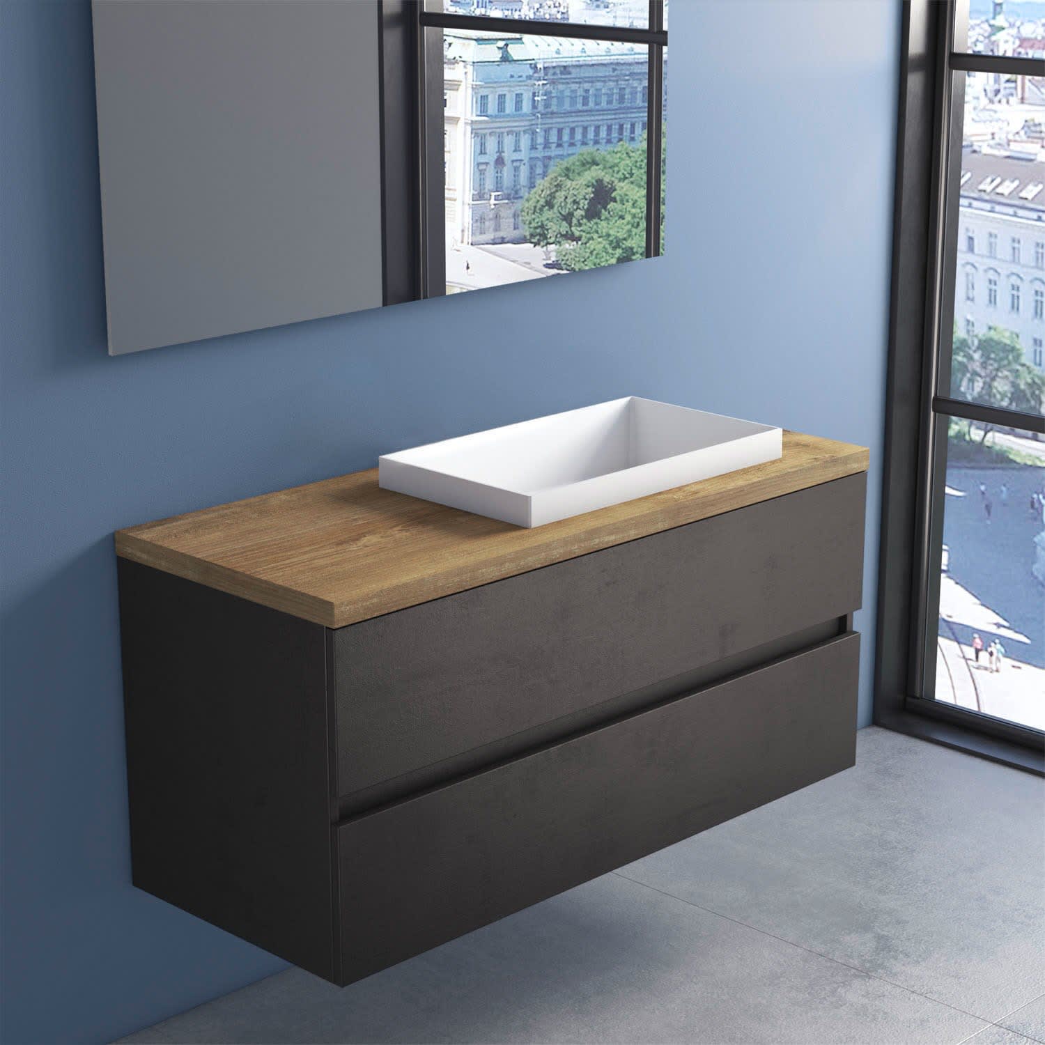 progettobagno Evo Terra Unterschrank 120 cm mit Platte in Holzdekor, ohne Hahnloch und ELY 60 Einbauwaschtisch , Ausführung rechts