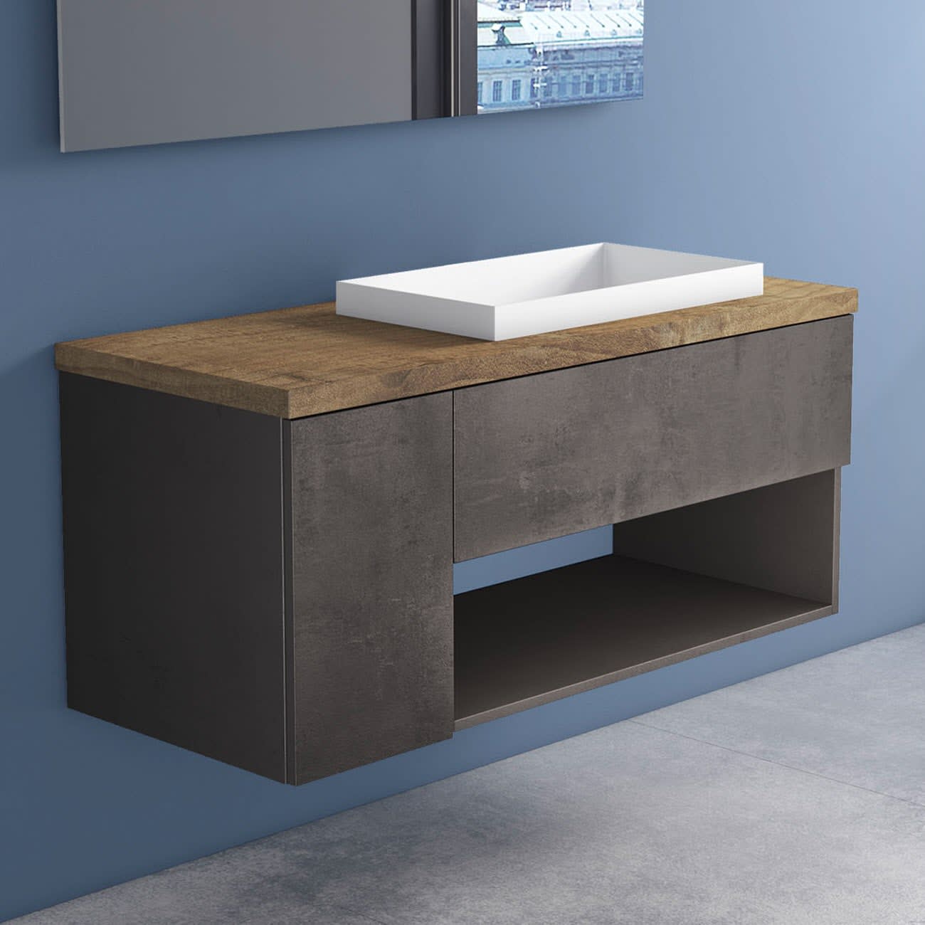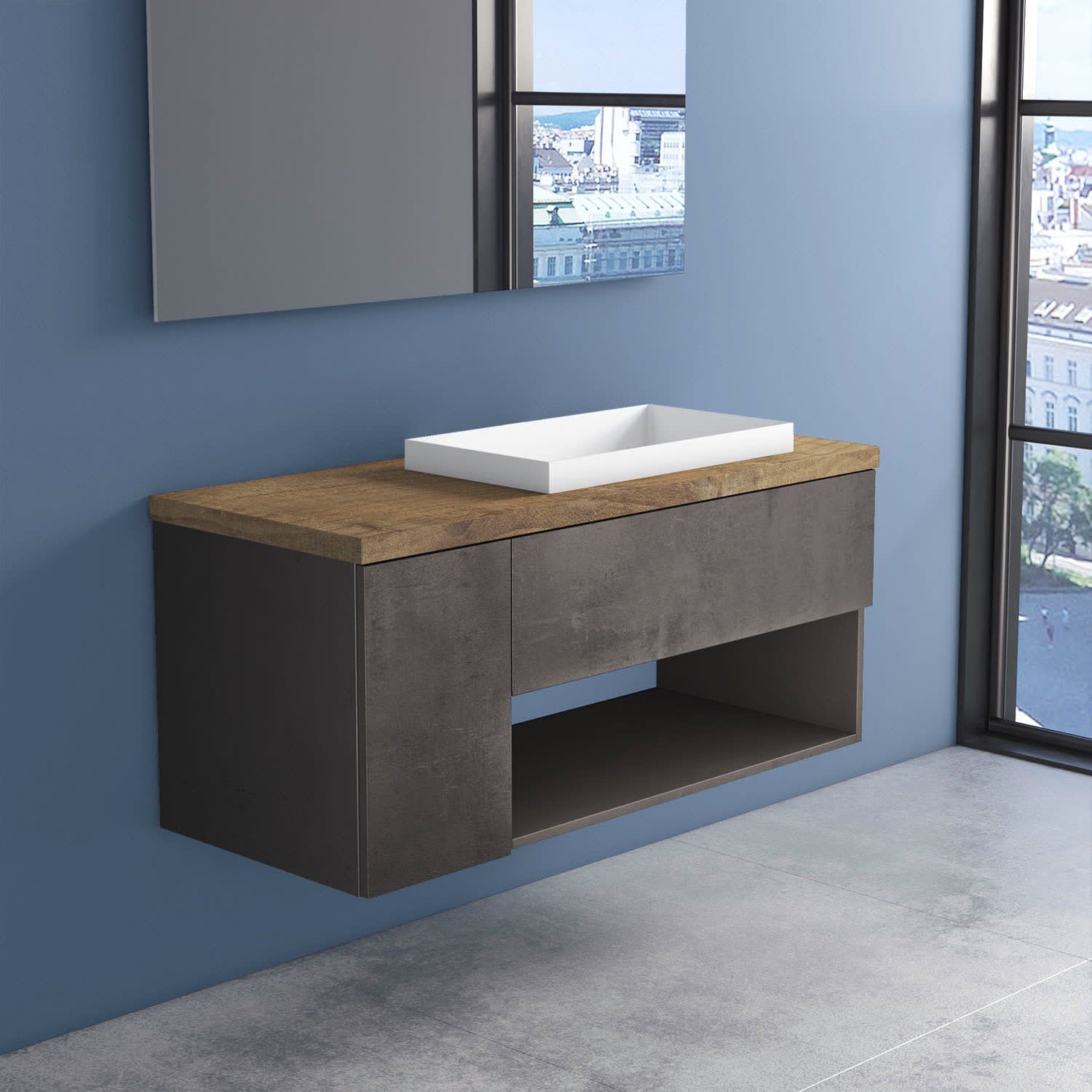 progettobagno Evo Terra Unterschrank 120 cm mit Platte in Holzdekor, ohne Hahnloch und ELY 60 Einbauwaschtisch , Ausführung rechts