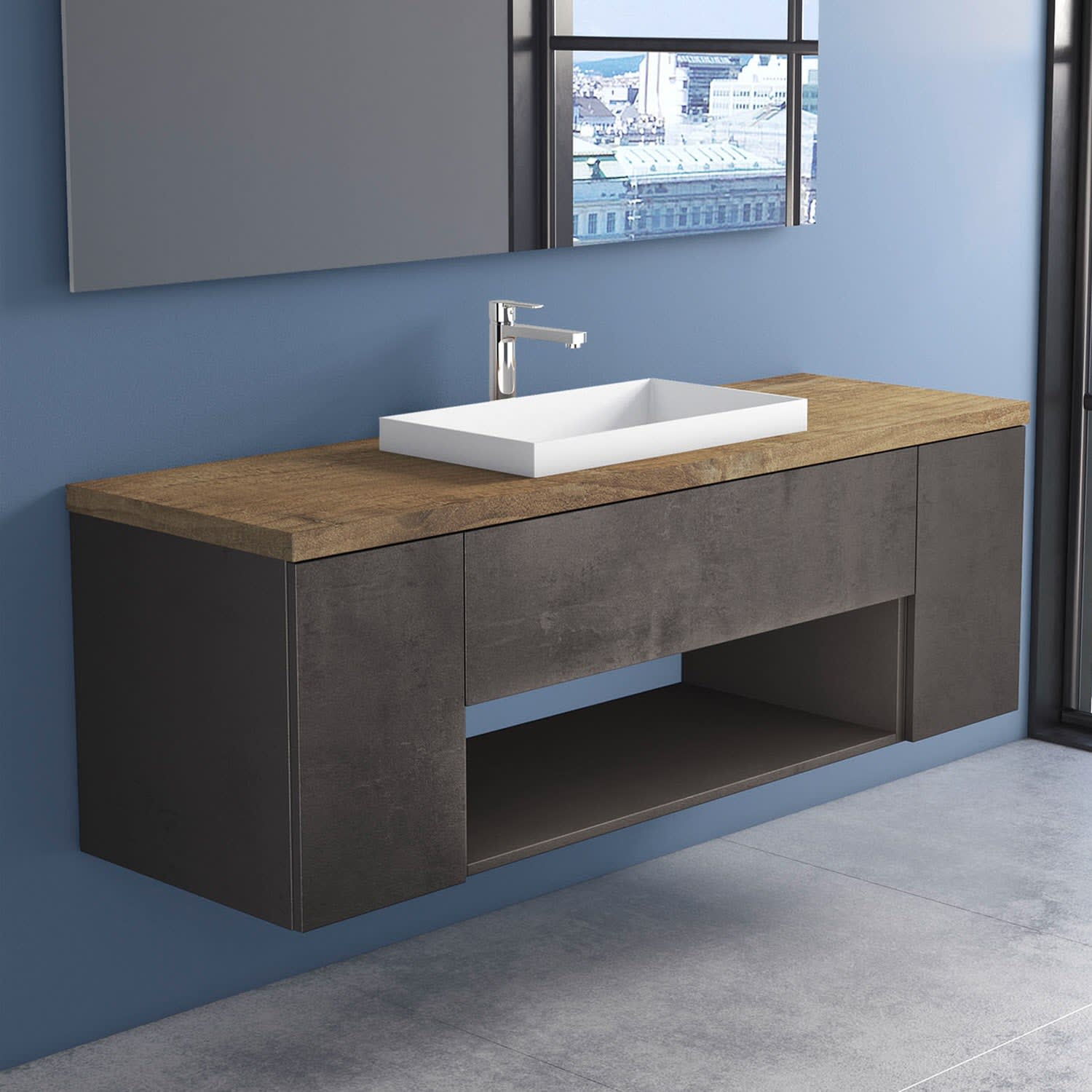 progettobagno Evo Terra Unterschrank 160 cm mit Platte in Holzdekor, Hahnlochbohrung und ELY 60 Einbauwaschtisch