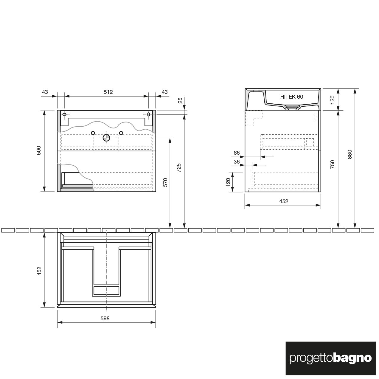 progettobagno Pianosa Hitek Waschtisch mit Unterschrank 60 cm wandhängend ohne Hahnloch