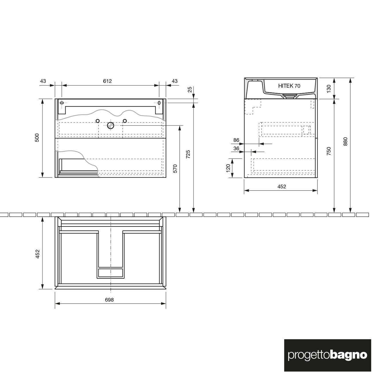 progettobagno Pianosa Hitek Waschtisch mit Unterschrank 70 cm wandhängend ohne Hahnloch