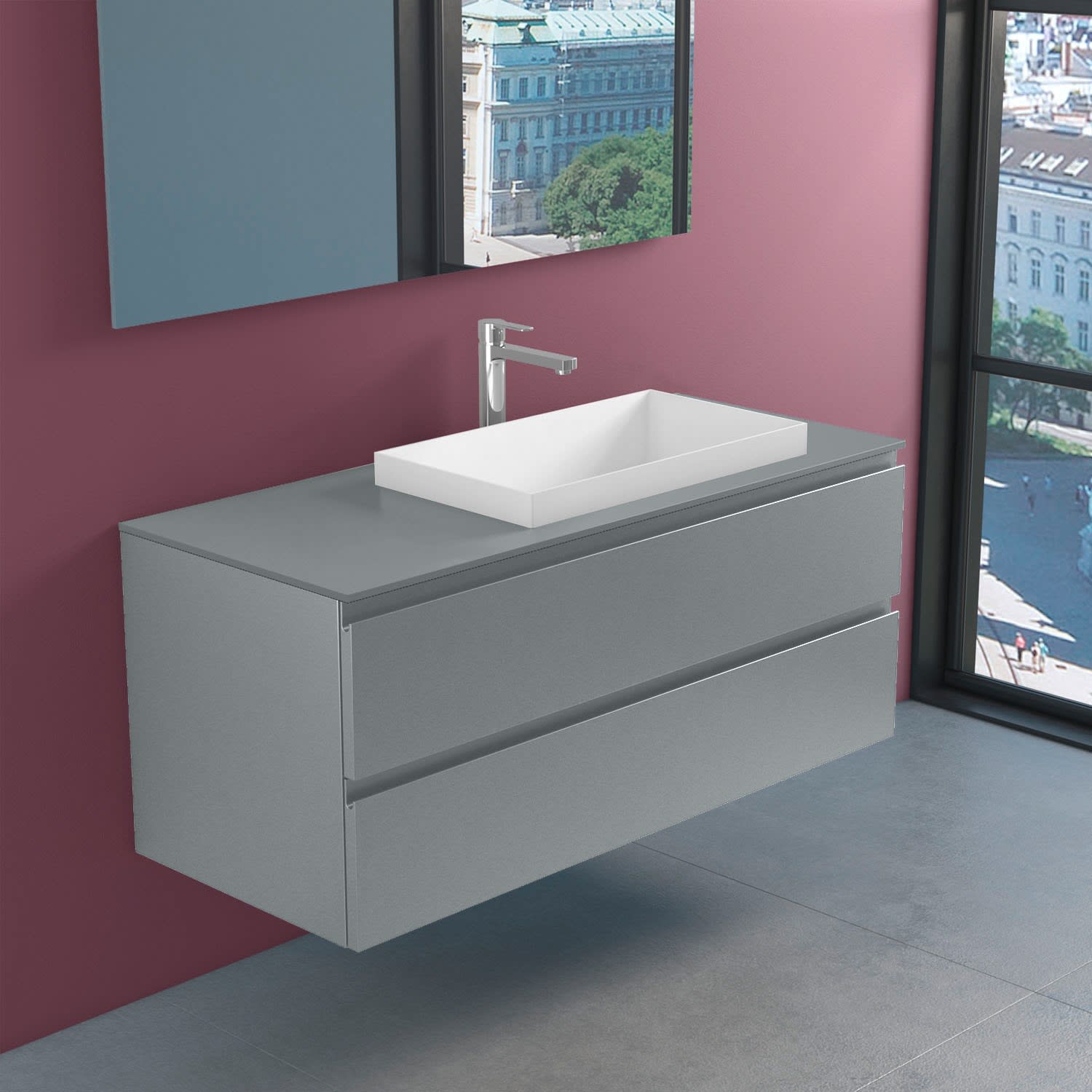 Stresa + ELY Badezimmerschrank mit modernem und minimalistischem Design, erhältlich in vier matt lackierten Farben, (weiß BI, schwarz NE, cappuccino CP, gallet grau GG) Fronten in mdf Stärke 22 mm, mit Griffmulde und Schubladen mit Soft Closing. Glasplatte aus 12 mm starkem, matt satiniertem, kratzfestem Kristallglas.Waschbecken Ely 60 in Solid Matt White