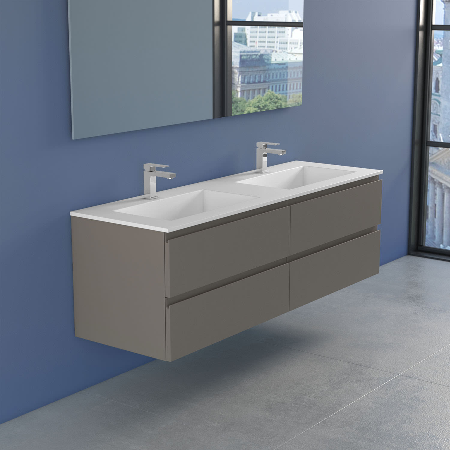 Stresa +Lago Badmöbel mit modernem und minimalistischem Design, erhältlich in vier matt lackierten Farben (weiß, schwarz, cappuccino und grau), Fronten in MDF Stärke 22 mm, mit Griffmulde und Schubladen mit Soft Closing.Waschbecken Lago 160 in Solid Matt White.