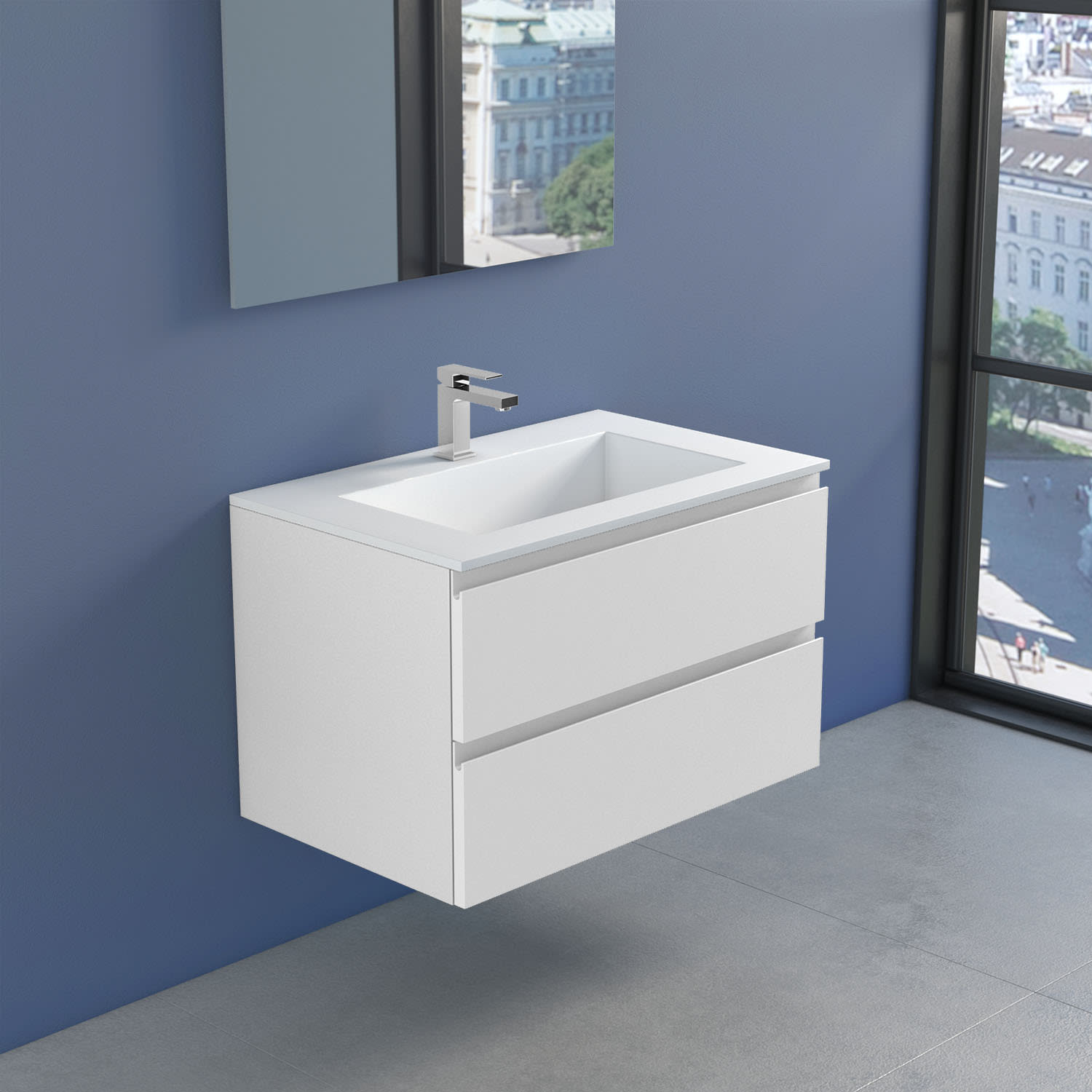 Stresa +Lago Badmöbel mit modernem und minimalistischem Design, erhältlich in vier matt lackierten Farben (weiß, schwarz, cappuccino und grau), Fronten in MDF Stärke 22 mm, mit Griffmulde und Schubladen mit Soft Closing.Waschbecken Lago 80 in Solid Matt White.