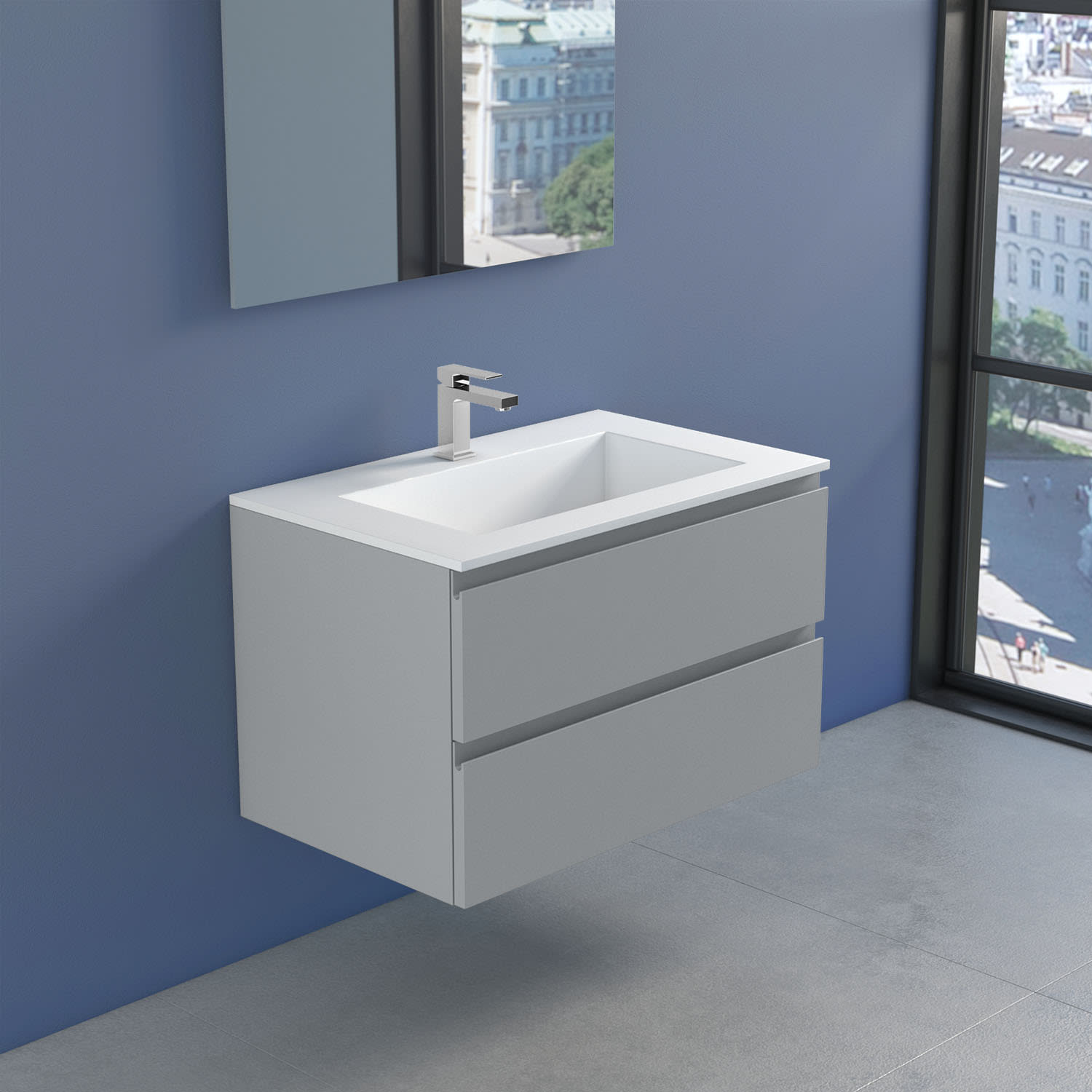 Stresa +Lago Badmöbel mit modernem und minimalistischem Design, erhältlich in vier matt lackierten Farben (weiß, schwarz, cappuccino und grau), Fronten in MDF Stärke 22 mm, mit Griffmulde und Schubladen mit Soft Closing.Waschbecken Lago 80 in Solid Matt White.