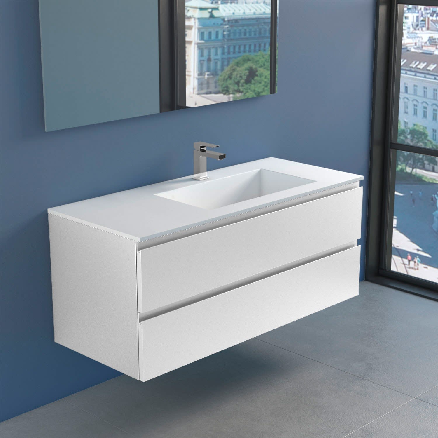 Stresa +Lago Badmöbel mit modernem und minimalistischem Design, erhältlich in vier matt lackierten Farben (weiß, schwarz, cappuccino und grau), Fronten in MDF Stärke 22 mm, mit Griffmulde und Schubladen mit Soft Closing.Waschbecken Lago 120 in Solid Matt White.